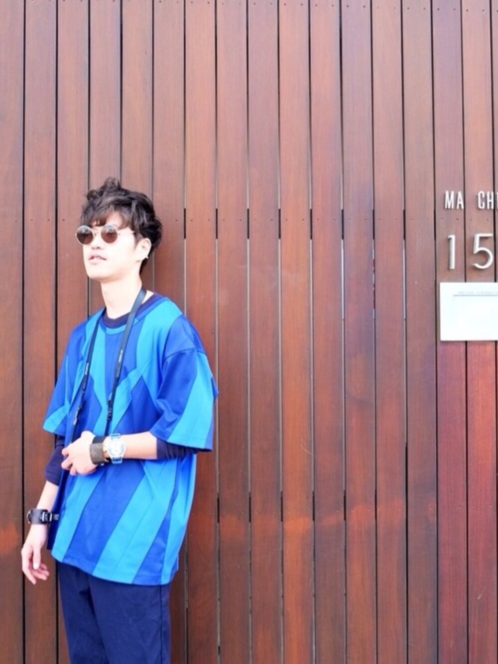 ブルー系のTシャツ/カットソーを着用したメンズの秋コーディネートの1枚目の写真