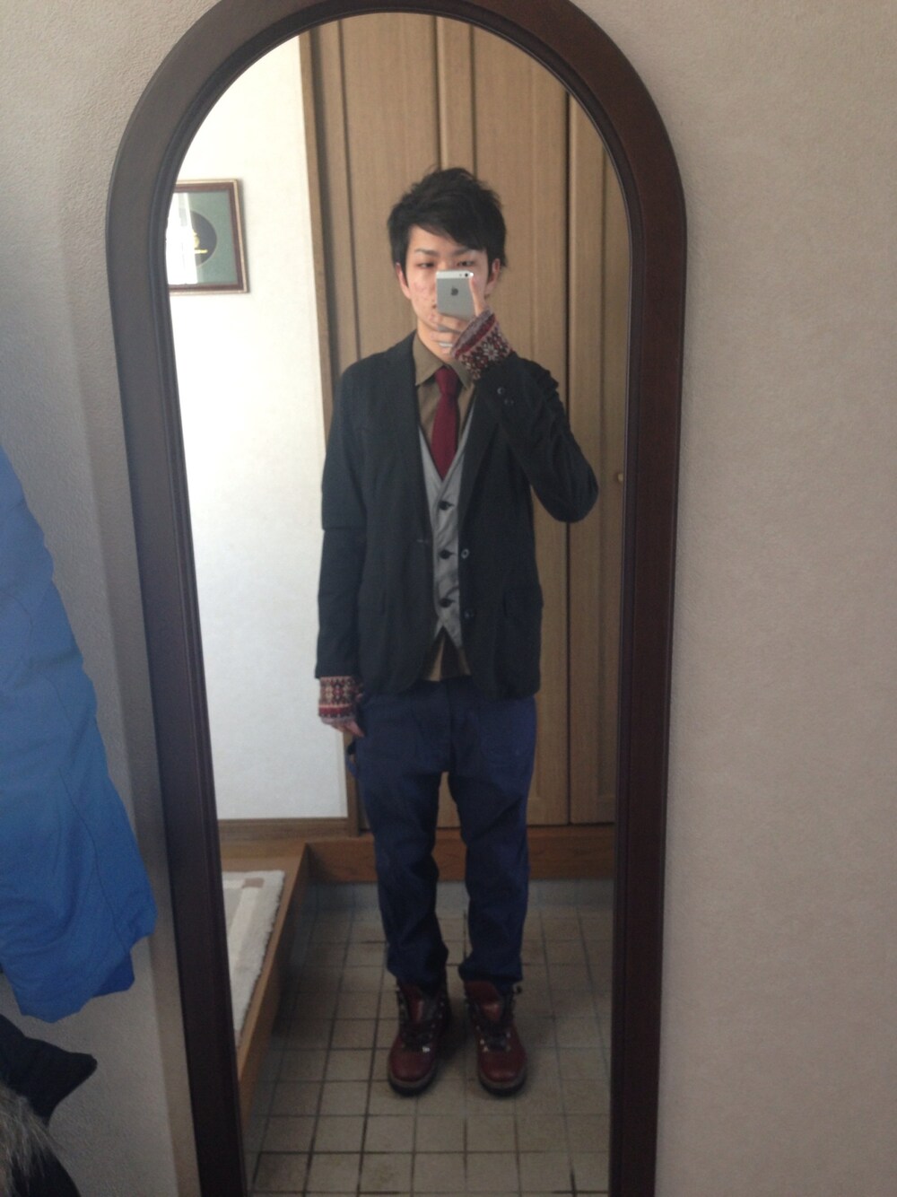 アウター:JOURNAL STANDARD ベスト:ブランド不明 シャツ:monkey time パンツ:bexist タイ:アーバンリサーチ グローブ:BEAMS ルーズなパンツで脱フォーマルにしてみました。