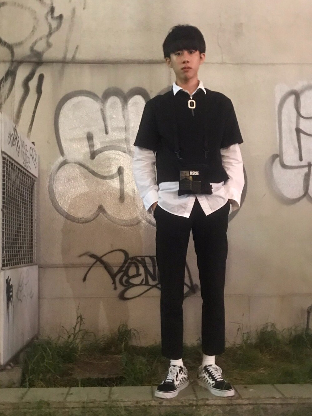 ブラック系のショルダーバッグ、その他のスニーカーを着用したメンズの夏コーディネートの1枚目の写真