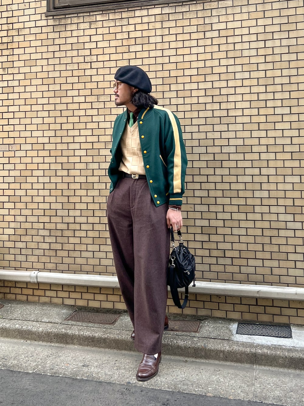 クラシックスタイル シャツ+ベスト+ネクタイに スタジャンを組み合わせると 程よくカジュアルになります トップスをジャスト ボトムをゆったり これさえすれば 誰でもクラシックスタイル出来ますよう