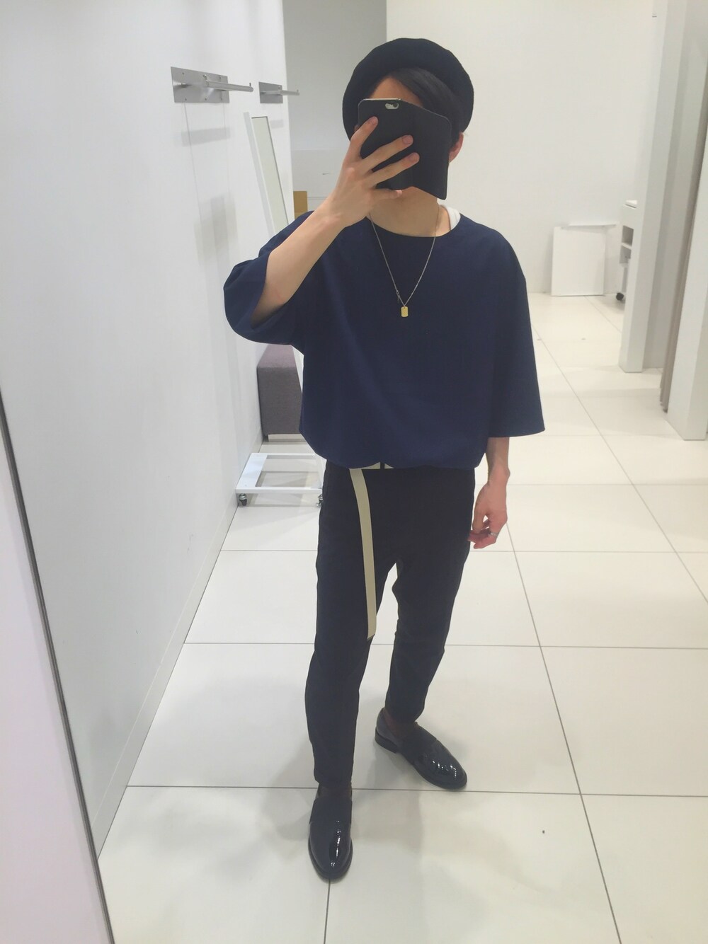 キレイめスラックス、プルオーバーのタックインに更ににエナメルのシューズを合わせてよりモードなコーデにまとめました👍 ロングベルトはレザーにする事でモード感を保っています(^O^) ガッツリモードに決めたい方はエナメルシューズオススメです(≧∇≦)