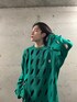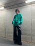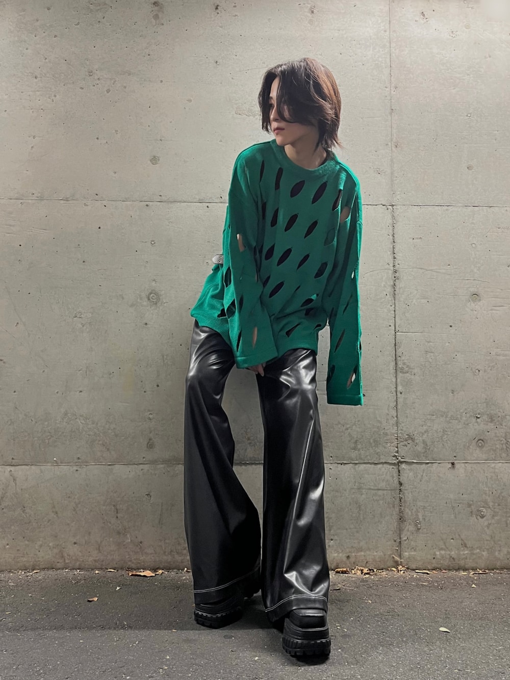 スラッシュグリーンニット×ワイドレザーパンツ