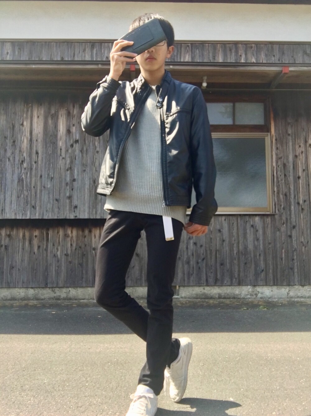 グレーニット, ライダース, 黒スキニーのシンプルコーデ!! このコーデ物凄いお気に入り✨ あと, 今日めっちゃ服買ってもらったから,明日からコーデ特に頑張っていきます٩(ˊᗜˋ*)و サイズ アウター L ニット L 黒スキニー 28…? スニーカー 27cm またね(* 'ω')ノ
