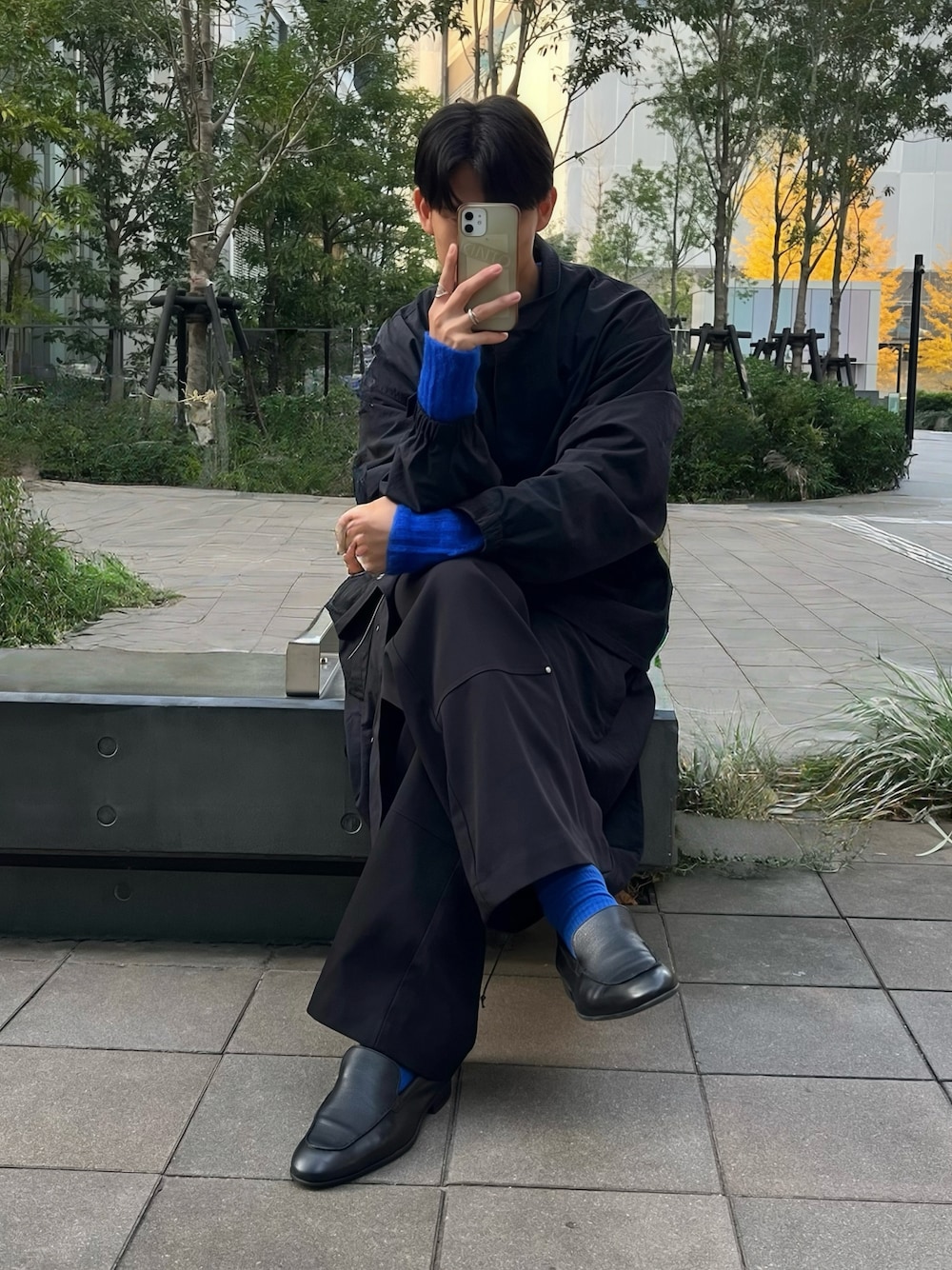 シンプルなブラックコーデだけど 青ちょい見せによっての小慣れ感。 コート : AIMNAIM スラックス : sellegrant 青ニット : pamm