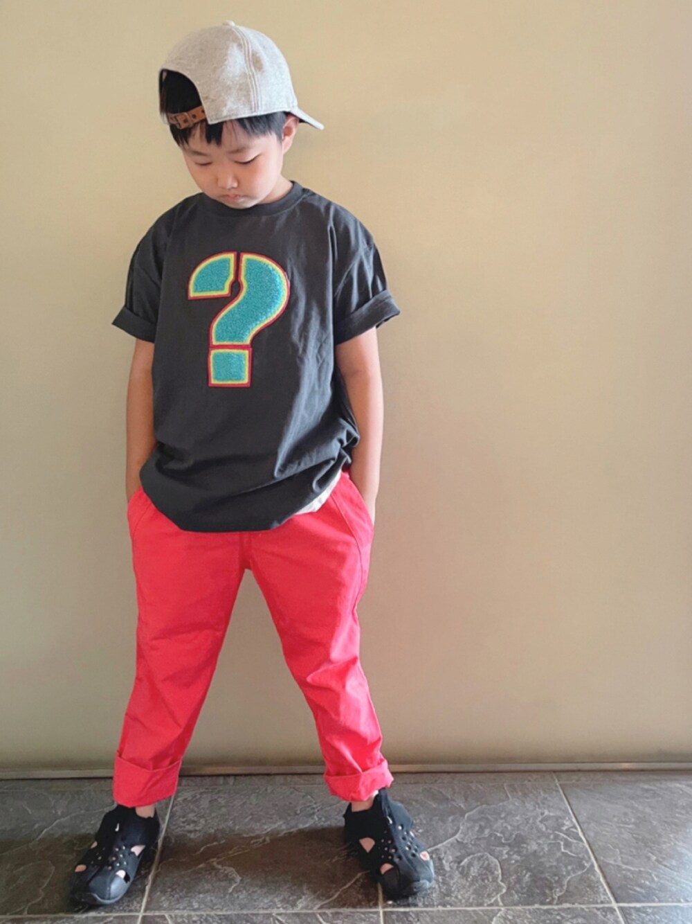 ハテナマークがエンボス加工されている マーキーズのTシャツ! 色合いが可愛いし、セールで激安に! マークの縁取りがピンクだから ピンクパンツ合わせで♪