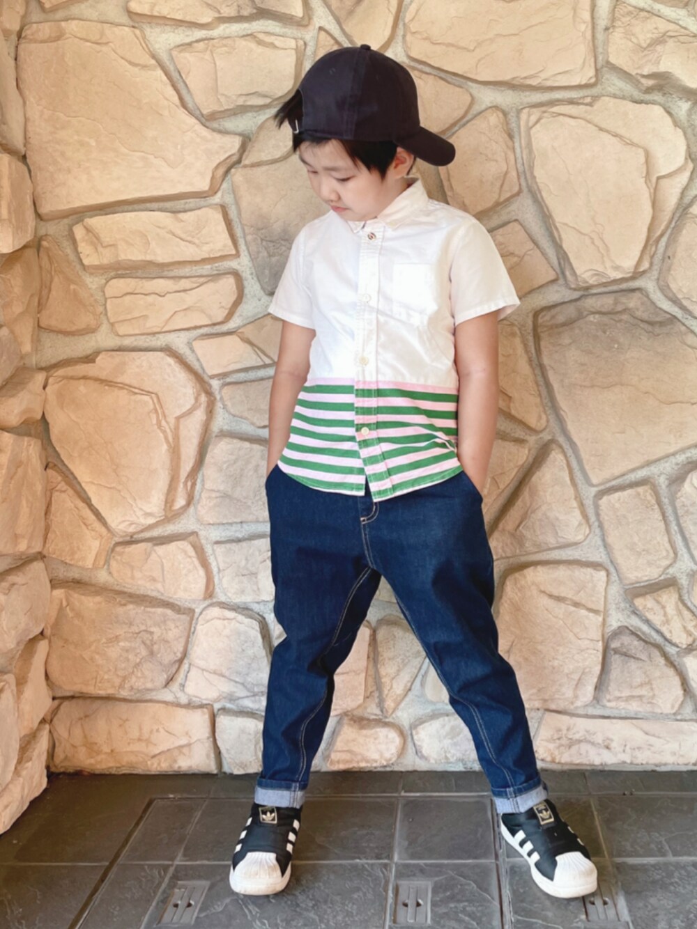 久しぶりのシャツスタイル ピンクとグリーンのボーダーが本当可愛い♪ シャツのボタンは上まで閉めたい派。 でも物凄く嫌がられる現実。。