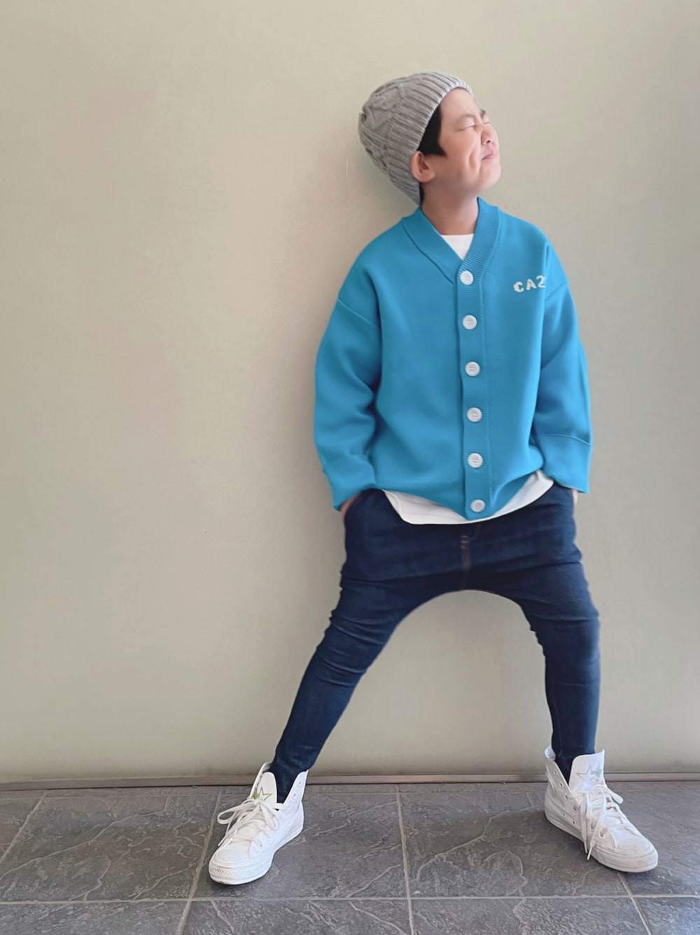 とにかく色が好みのカーディガン!! ターコイズブルー可愛いよ〜!! 白いビッグボタンも素敵⭐︎ すんごい久しぶりにサルエルで。 サイズアップして買ったのに 寝かせていてら すでに小さくなっててショック!
