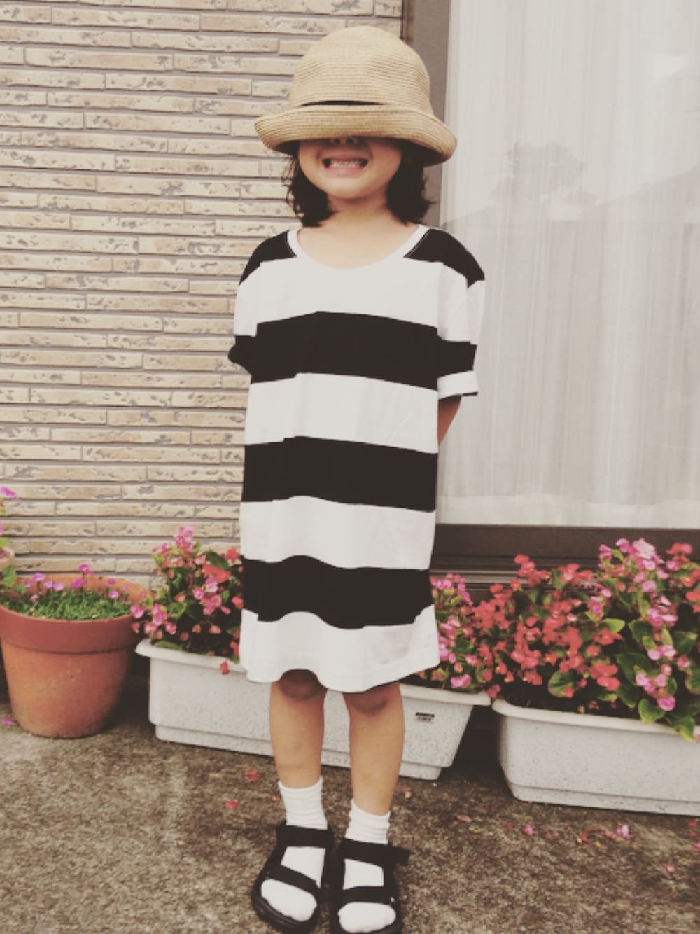 無印さんの太ボーダーTシャツ。 ママのLサイズ着せたらワンピみたくなったぁー🙌