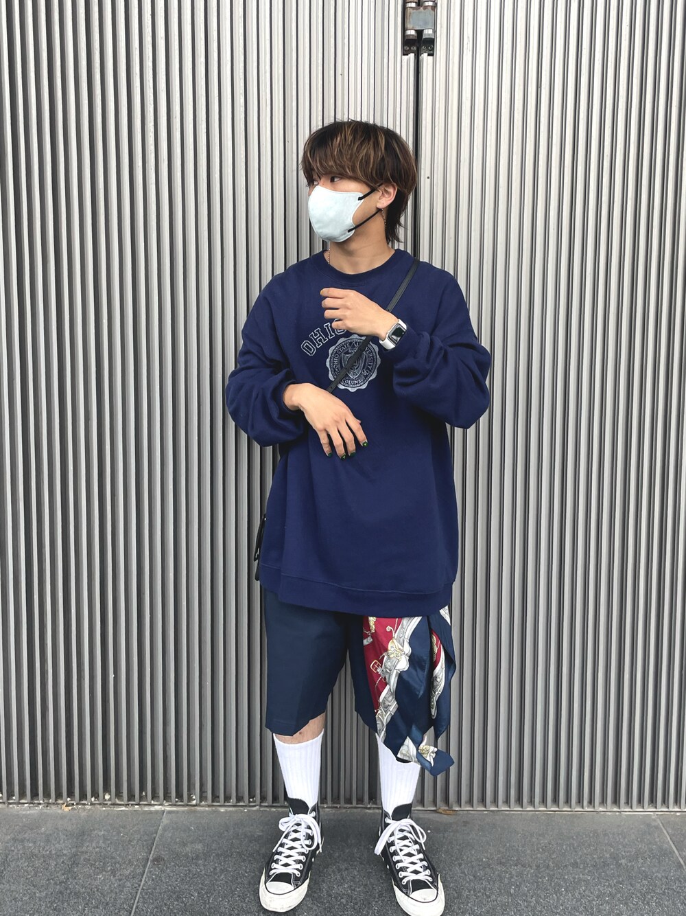 今日は古着コーデ✌🏻 上下ネイビーを主役にしてスカーフでワンポイント色加えるの可愛いっ 台風すぎた瞬間大阪めちゃくちゃ気温下がってるから風邪だけは引かんようにみんな手洗いうがいはちゃんとしてこね🤞🏻