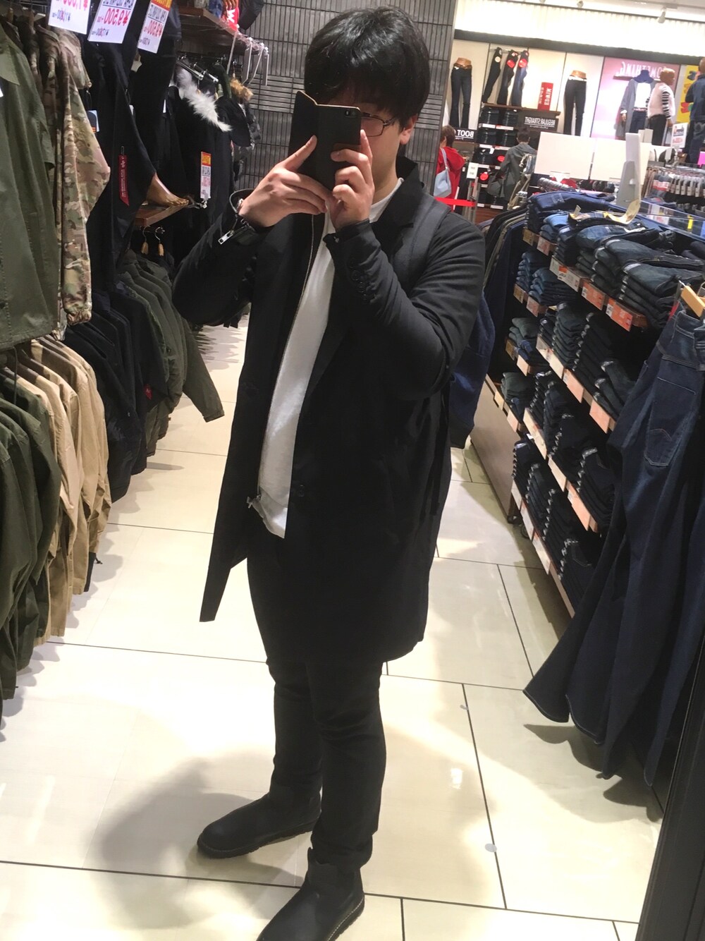 分かりづらいけど。コートの下にライダースを着てアウターインアウターしてます
