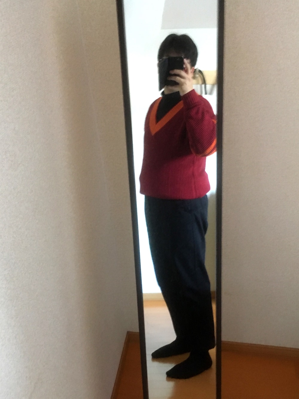 秋のコーデ トップス:dコレクション チルデンニット パンツ:UNIQLO U テーパードアンクルチノ 靴は黒革や赤のキャンバスシューズを履くとバランスが良いと思います。