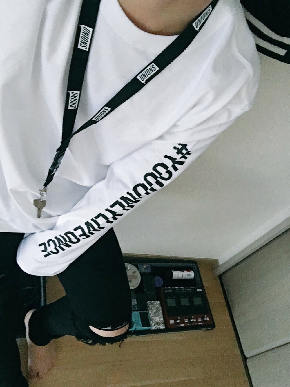 DEATHKISSの新作着ました。 モデルをUNIONSのkikkiくんがやっていたのでUNIONSグッズのネックストラップ、ノーブランドのダメージスキニーと合わせました。