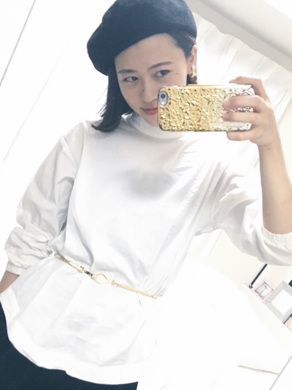 白シャツフェチです。 ノーカラーとかボトルネックとか いろいろ集めちゃう、、、。 これはguなのに、 肩のくしゅっと感や 柔らかさが好き。 ゴールドのヴィンテージの サッシュベルトをつけて レトロに着るのがお好み。