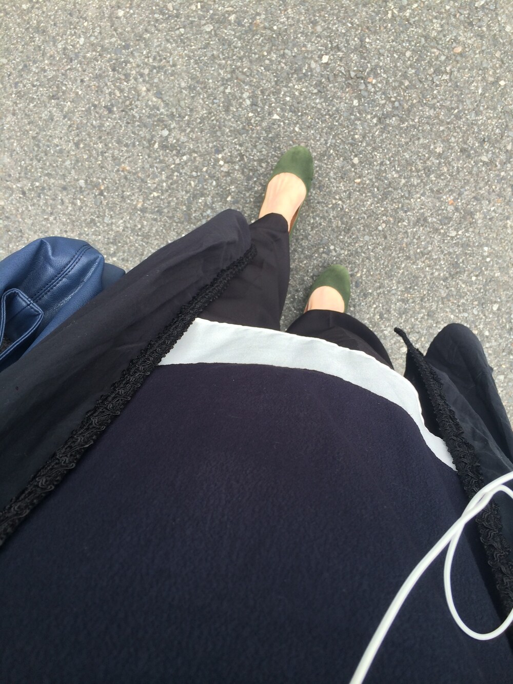 Black&Navy blueのコーデ 涼しくなってやっとロングカーデ 着れた カーキのパンプスで好きな音楽聴きながらご機嫌で出勤♪
