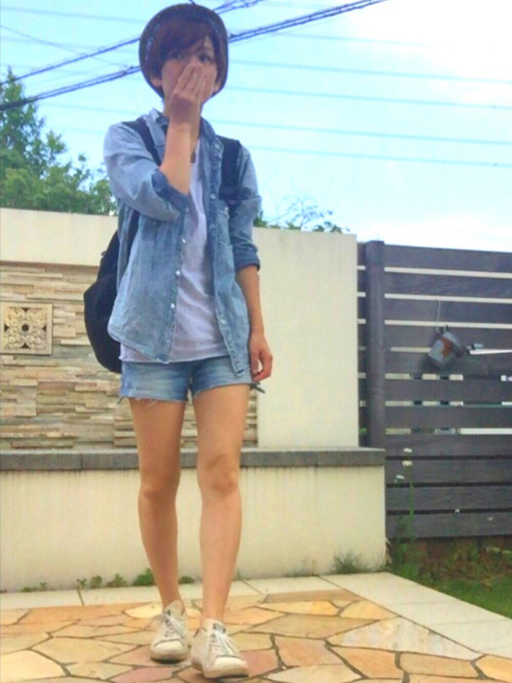 デニム×デニムでシンプルコーデ♡ ショートカットだとショートパンツ×スニーカーは少年になるw 見てくださりありがとうございます◡̈⃝