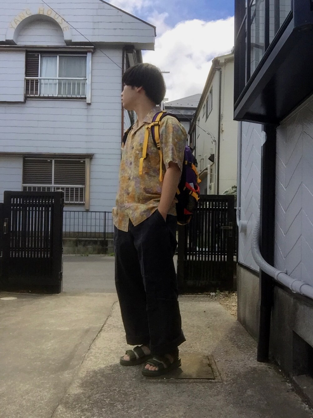 古着のアロハとワイドパンツにサンダル。夏。