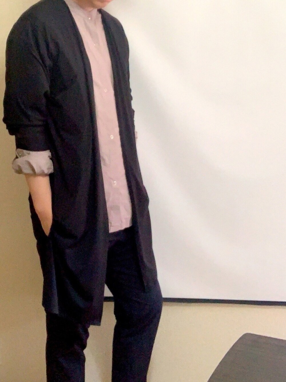一つ前のコーデのカーディガンだけ変えたバージョン。黒のエアリズムカーディガンはレディースです。薄手、ロング丈、ボトムスと同じダークカラーなのでより縦のラインが強調され、細く見えます。シャツごと袖をまくって手首を出してスッキリ見える様にしました。