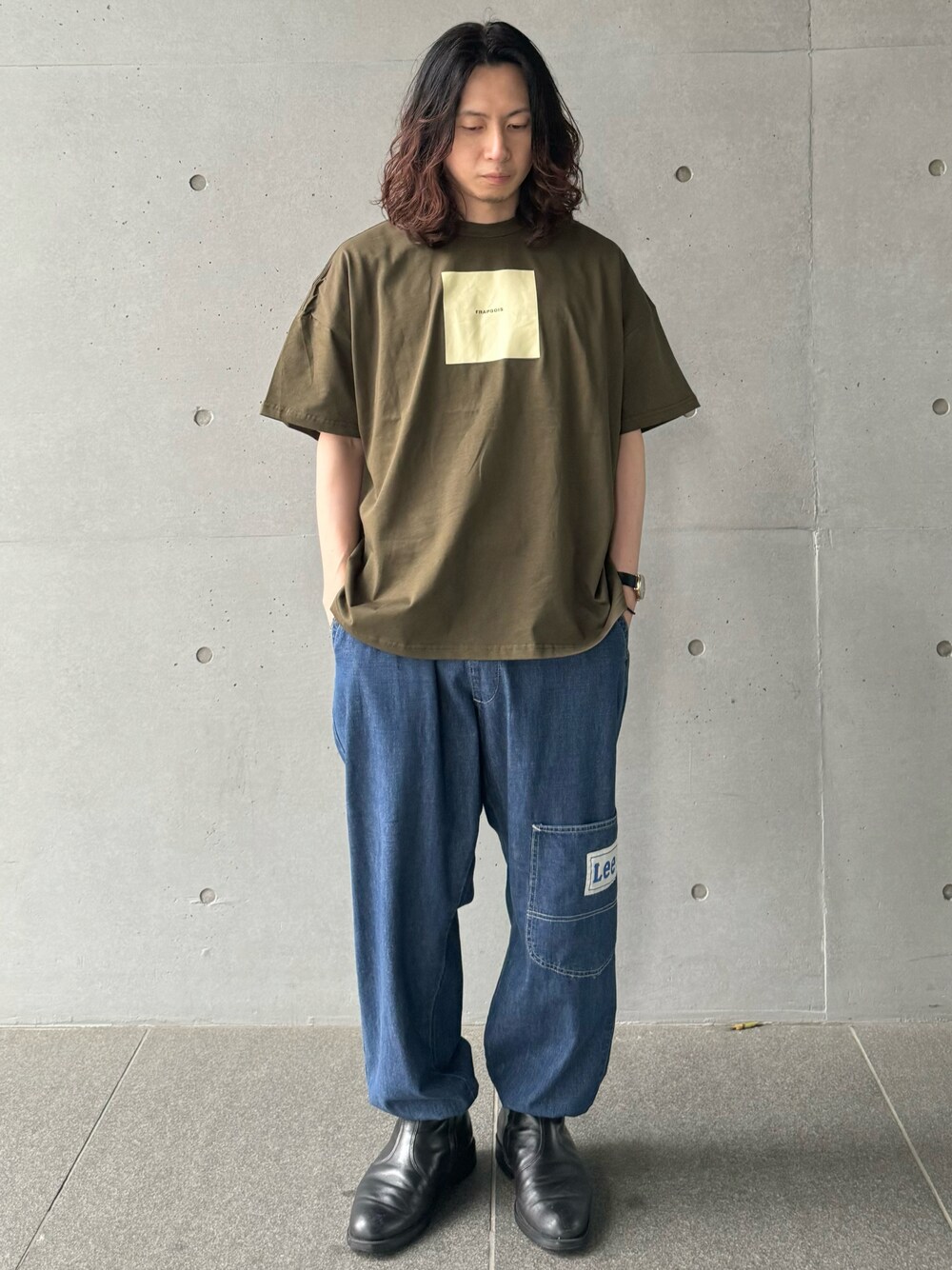【アミューズT】 着用サイズ/カラー : 2サイズ(L)/カーキ サイズ感 : ややゆったり 着用感 : どんなアイテムとも合わせやすいカーキのTシャツ。 今回はLeeとのスペシャルコラボデニムと合わせたリラックススタイルでコーディネートしました。 【Lee×FRAPBOIS デニムパンツ】 着用サイズ/カラー : フリーサイズ/ブルー サイズ感 : ジャスト 着用感 : Leeで人気のパンツ「Fleeasy」をベースにしたイージーパンツ。 裾のドローコードを絞ってサルエル風に着用しました。 Tシャツ×デニムのシンプルなコーディネートも、裾を絞ることでフラボアらしいシルエットに。 リラックスした着心地ですが、他にはない雰囲気がオススメです。 TシャツはWEB限定アイテムとなります。