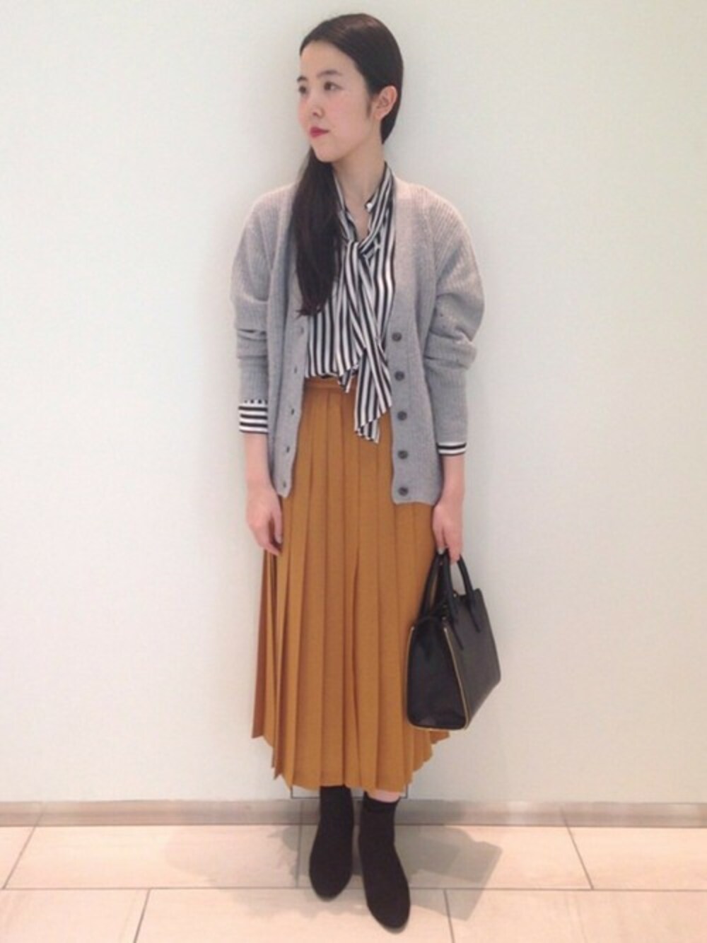 ニットに重ねたブラウスはスカーフ付き。 さらりとまいてクラシカルに。 気温も下がり、レイヤードが楽しい季節になりましたね!