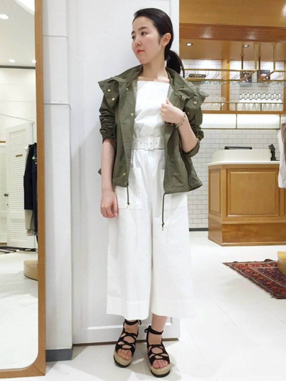 白色オールインワンとレースアップサンダルとの組み合わせで 大人のカジュアルスタイルに。 フードが取り外し可能なのもおすすめです。