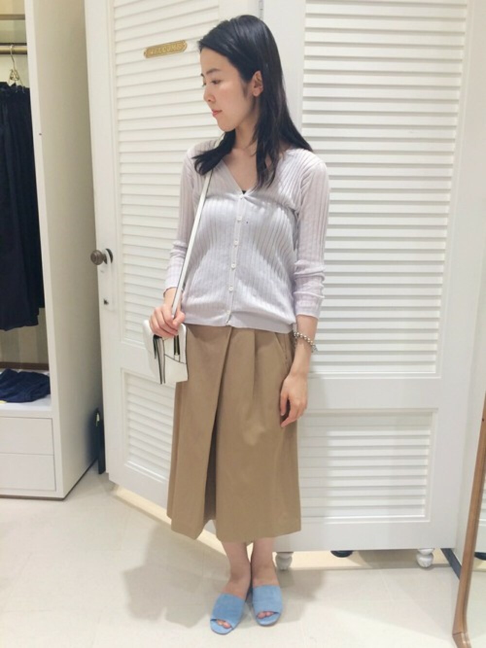 グレーのカーディガンは落ち着いた雰囲気でコーディネート。 足もとはブルーでさし色をプラス。