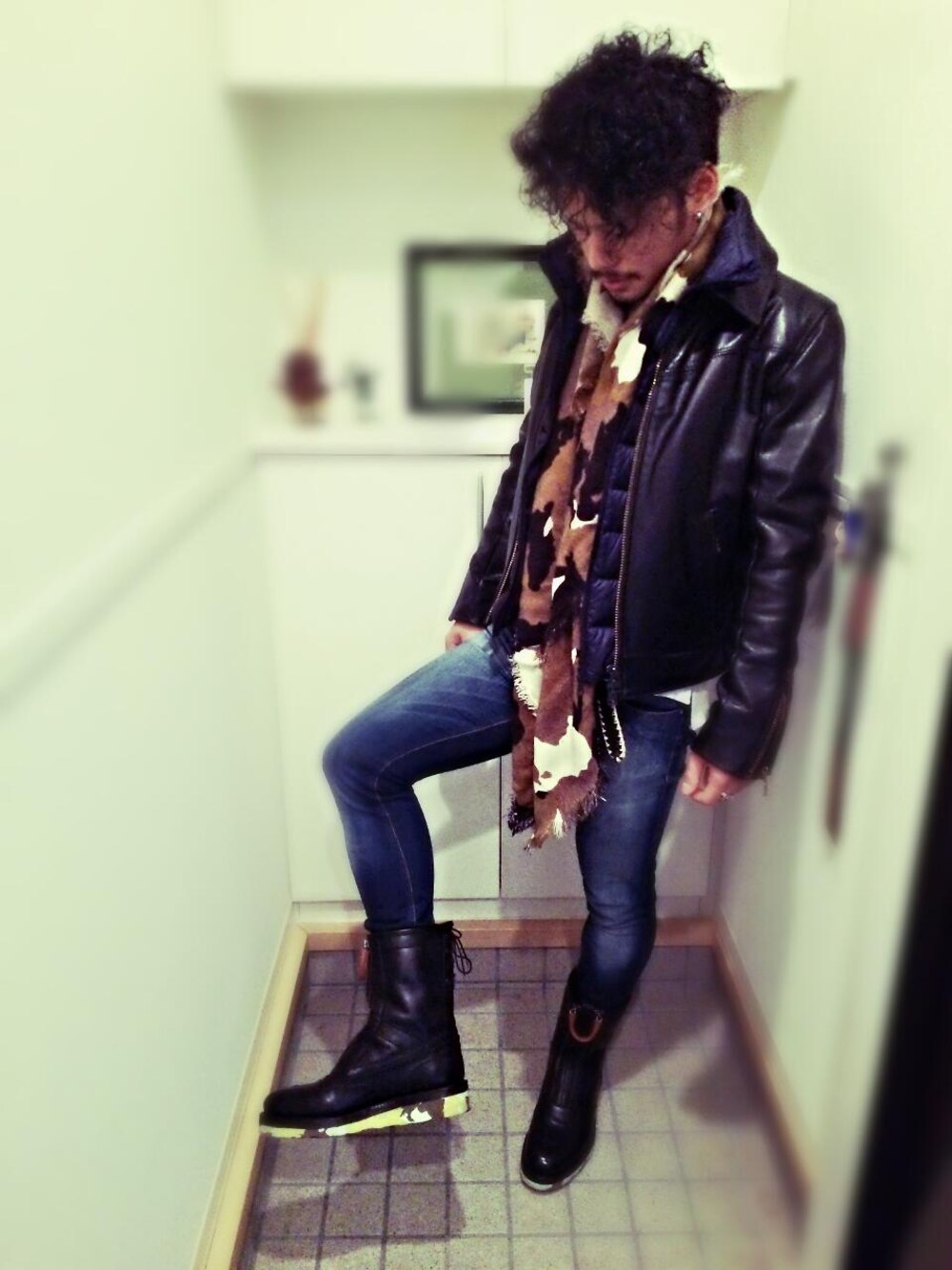ライダースは全て手縫いの自作です!! 自分で作っただけあって低身長、肩幅広めな僕でもいいサイズ感(´ 3`) UNIQLOのベストはレディースのL、 ブーツは最近張り替えてもらったばっかりのカモフラソールカスタムです! 寒くなってきて服に対する物欲が止まりません(;´_ゝ`)
