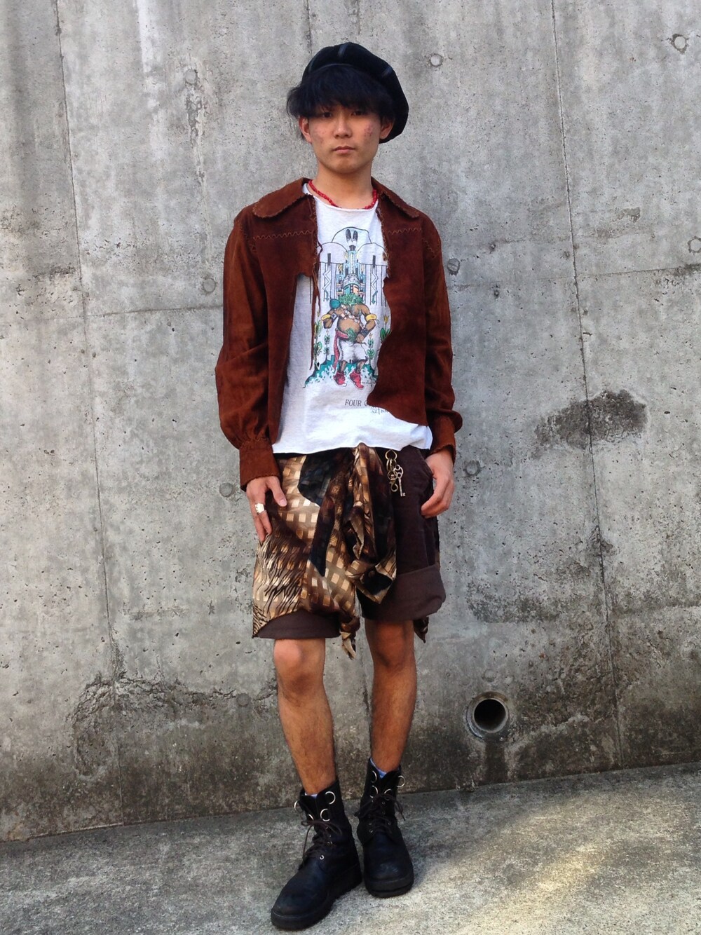 vintageレザーシャツ 80'sシャツ コーデュロイハーフパンツ 全て下北沢のAll990yen古着屋ラグラマグラで購入。 和柄シースルーシャツ 渋谷の古着屋qosmosにて購入。 ベレー帽とブーツは頂き物。