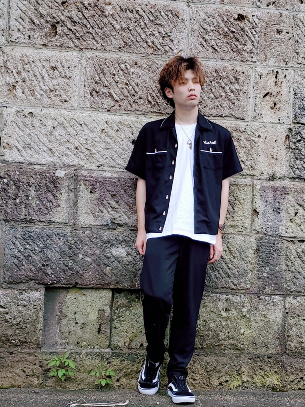 ボーリングシャツコーデ! 前に載せたコーデと似てますがインナーを半袖に変えてパンツをGUのアンクルパンツに変えました! このシャツも古着屋で購入したデッドストック品! 後ろの刺繍とボタンがボーリングのピンになってるデザインに一目惚れしましたwww