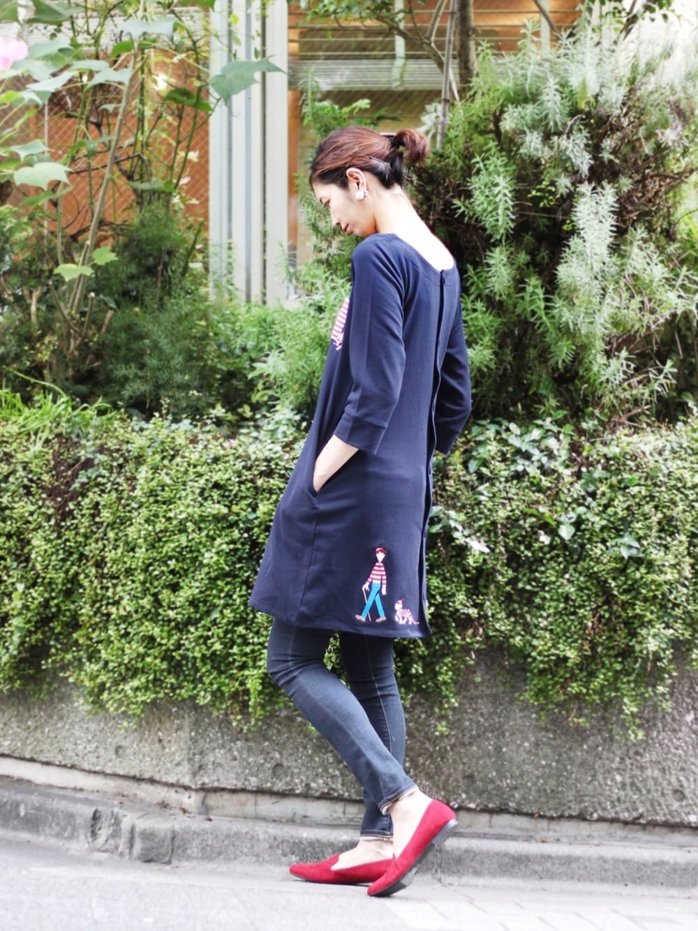 「ウォーリーを探せ!」コラボから、バックボタンのワンピース。シルエットも美しく、厚手すぎない生地と七分袖でロングシーズン使えるアイテムです♪