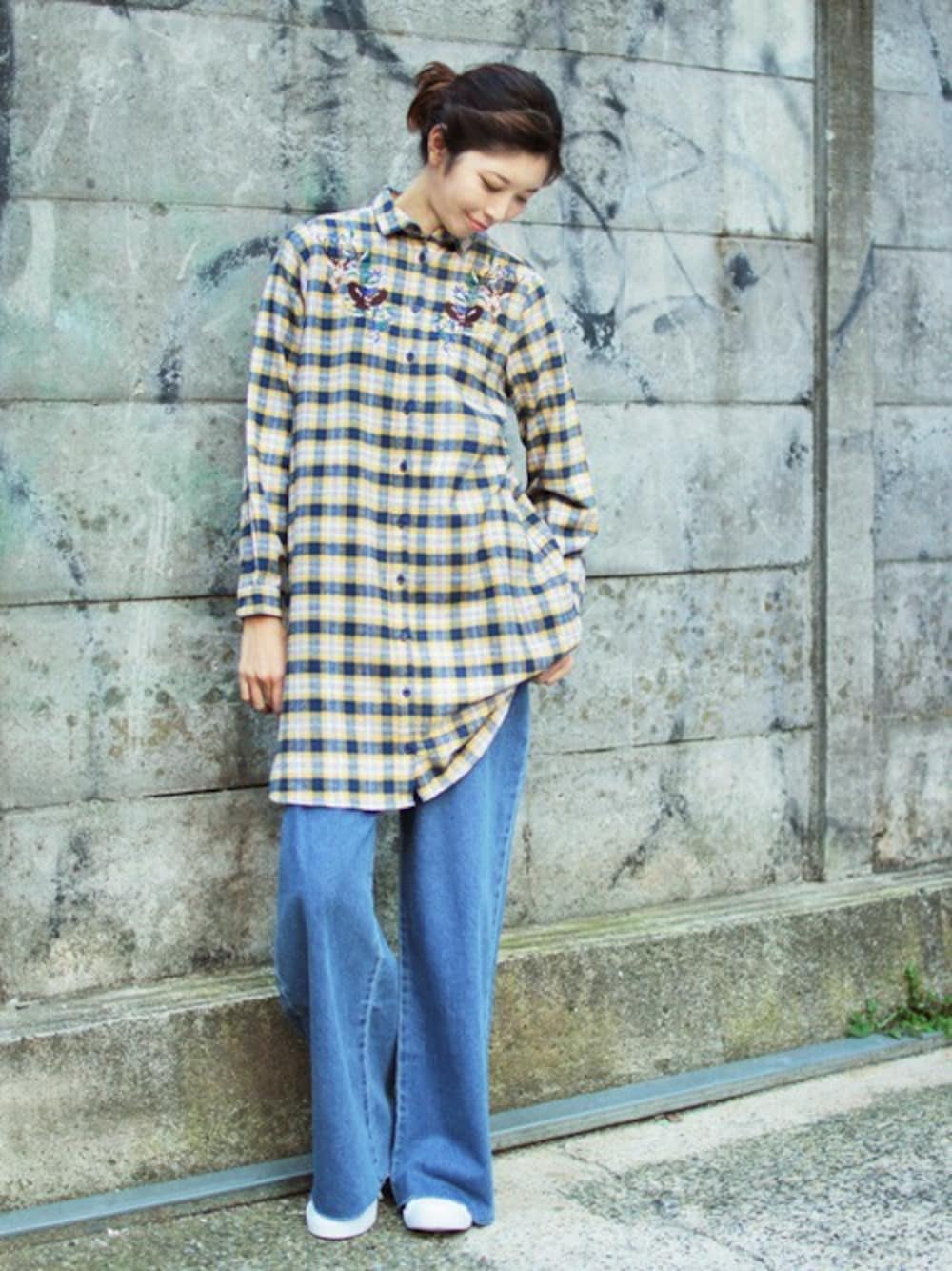かもさんのシャツワンピース「エンブロイダリーチェックシャツワンピース/アニマルブランチ」を使ったコーディネート