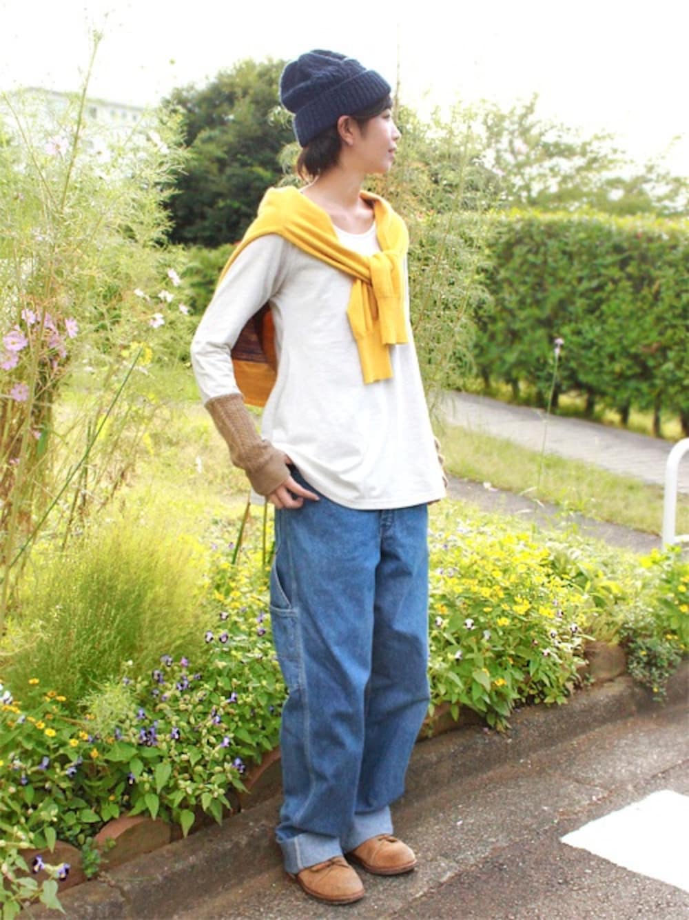 アームウォーマーをしているようなギミックの効いたロンTをペインターパンツでラフなスタイルでコーディネート。 アクセントカラーにマスタードカラーのカーディガンをプラスしました。