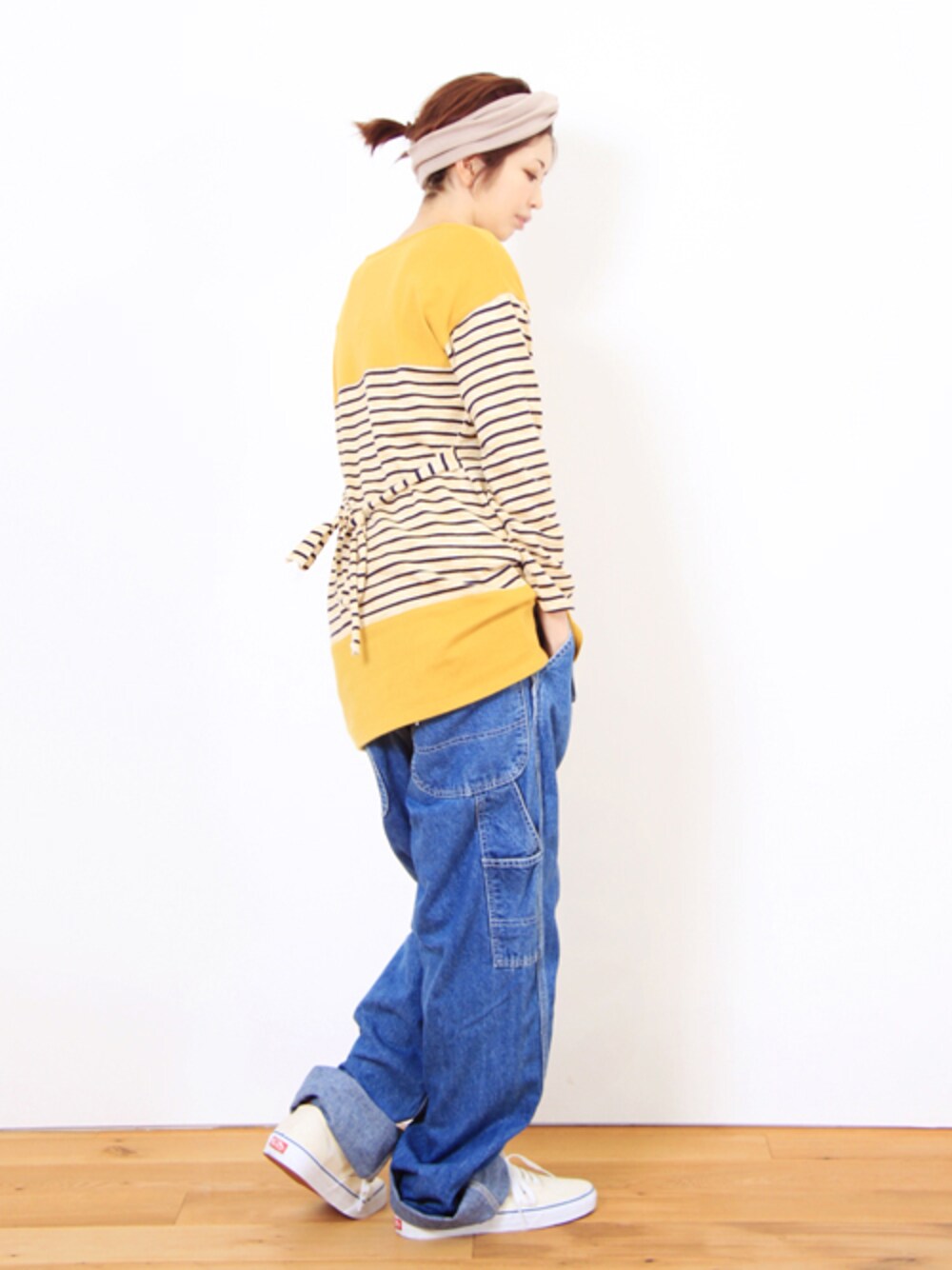 切り替えがポイントのボーダーチュニックはゆったりめのボトムスに合わせてボーイズライクに。 ウエストのリボンでかわいさもプラス!