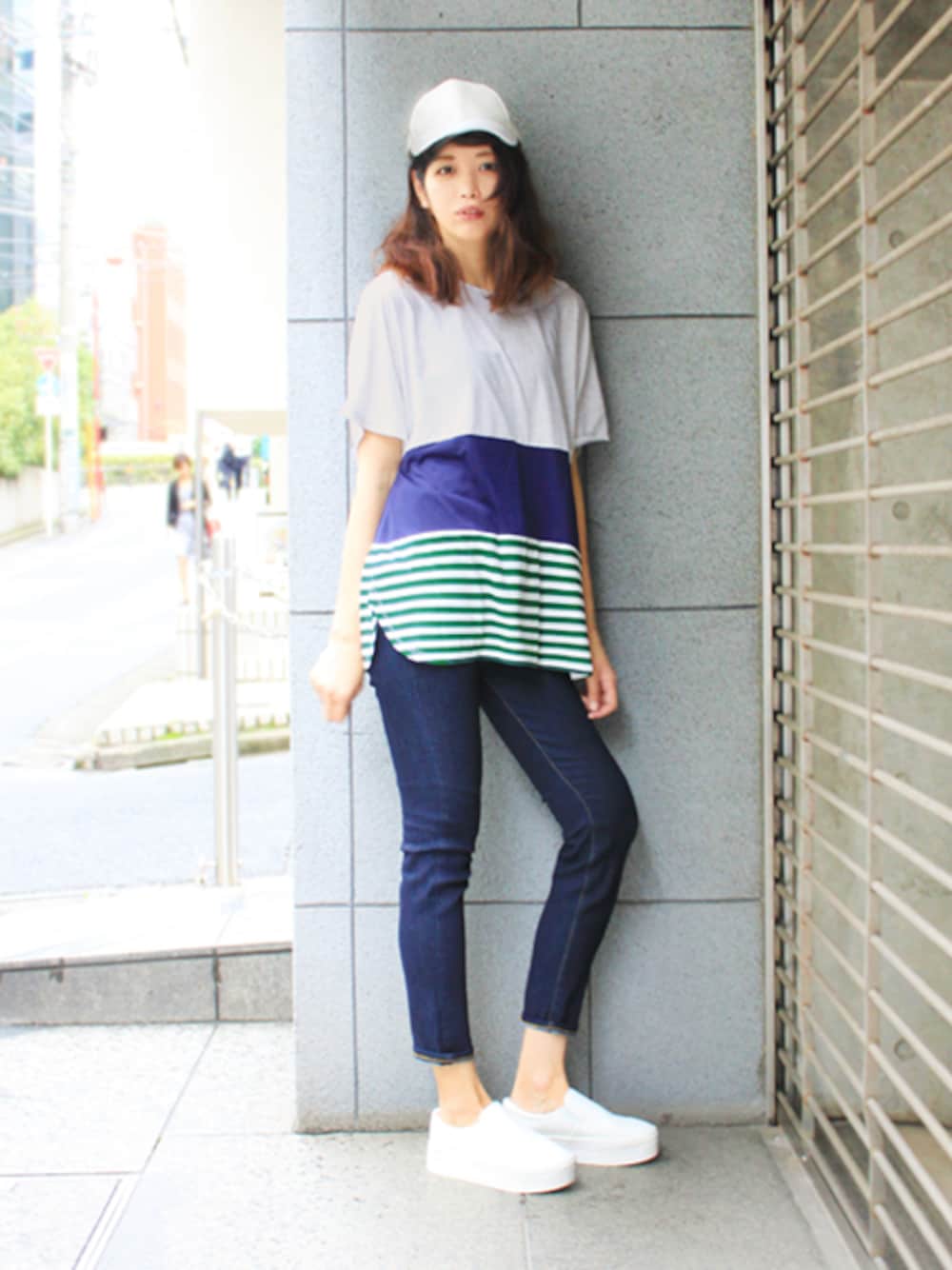 カラーブロッキングされたゆったりしたTシャツは、ラフにキャップやスニーカーでコーディネート。1枚でグンと映えるアイテムです。