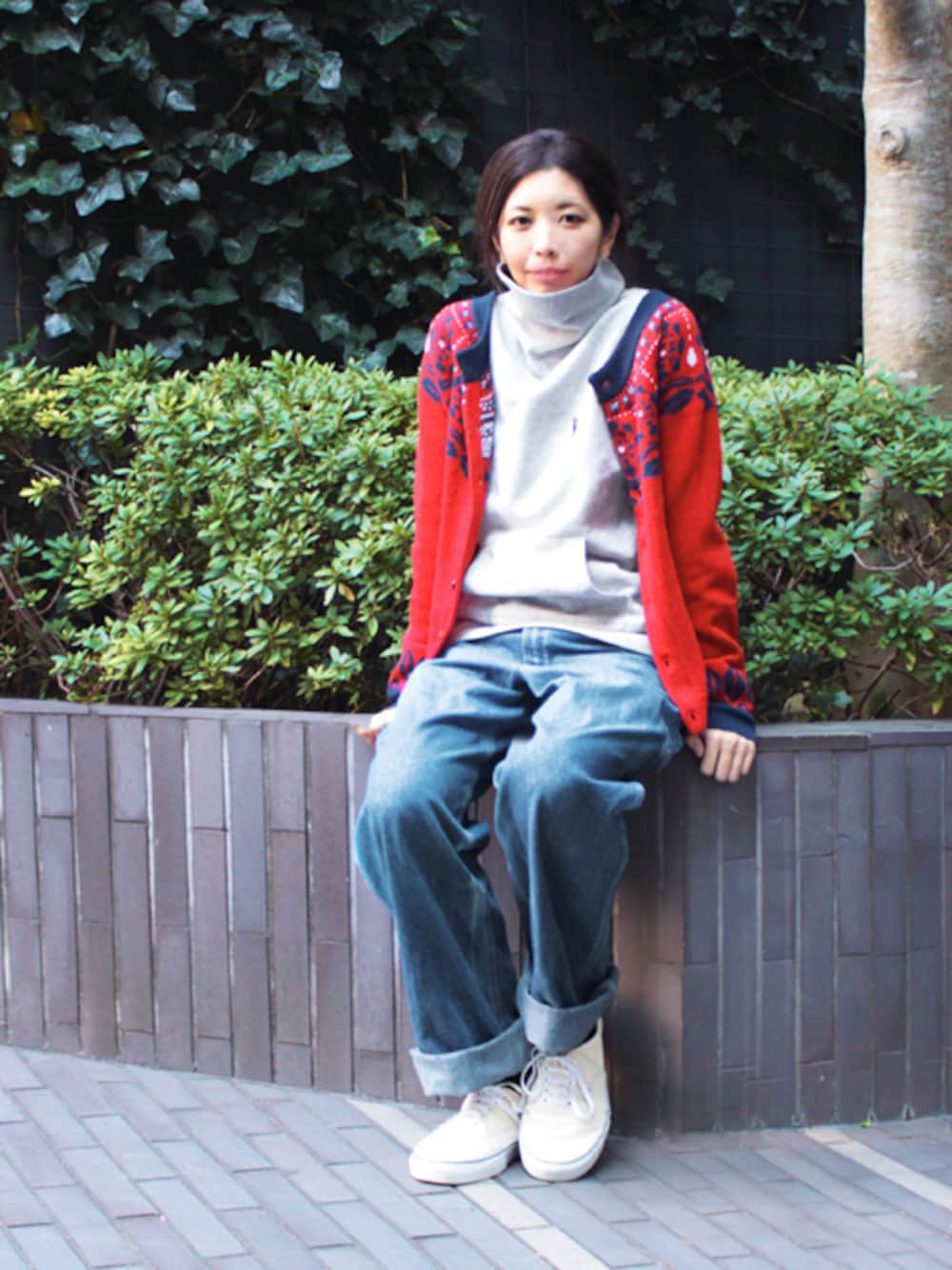 タートルネック裏起毛の暖かさ抜群のスウェットは今年一番のお気に入り。 シルエットはすっきりしているのでスカートにもパンツにも合うおすすめの1枚です♪ 暗くなりがちな冬のコーディネートはまず全体を明るく、暖かみのある赤を取り入れて。