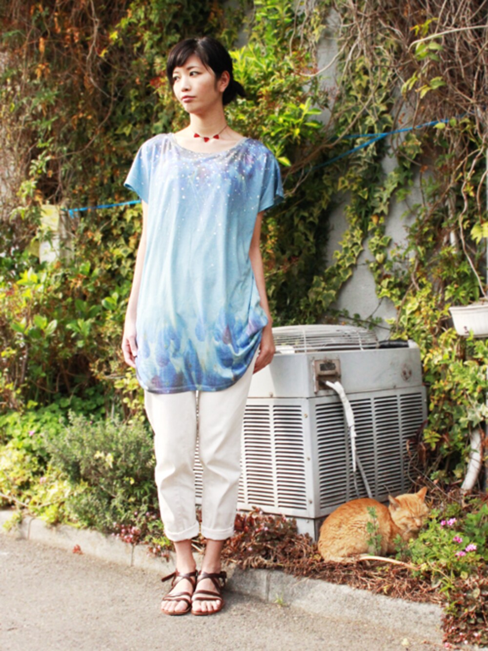 押し花作家、イラストレーターの森野美紗子さんとのコラボレーションワンピース。 爽やかなブルーとスッキリとしたえりもとが春から夏にかけてぴったりのアイテムです。 白ボトムとサンダルをあわせたお散歩スタイル♪