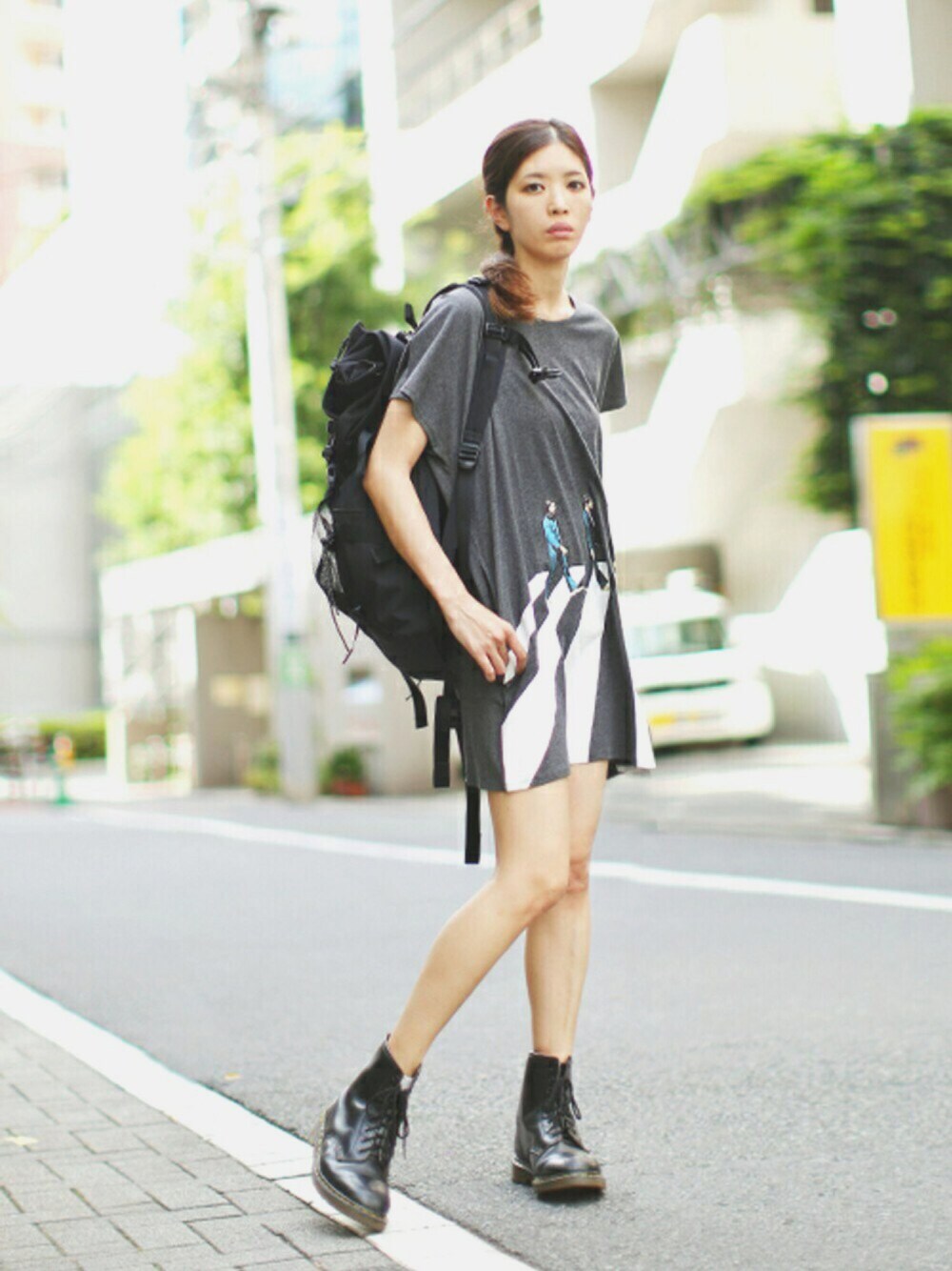 ビートルズの『アビー ロード ウォーク』がプリントされたワンピースを1枚で。 メンズライクなバックパックとブーツを黒でまとめて全体的に引き締まったコーディネートに。