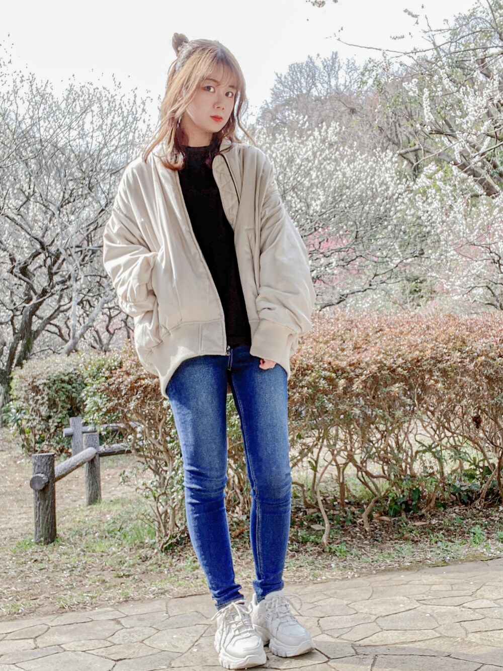 春コーデ記録...10℃<19℃ このアウター着てったけど暑かった! もっと薄着でも良かったかも🤣 駅前の梅が満開だったので、せっかくならとお散歩して梅林に行きました🌸 動きやすくデニムにスウェットです🤟🏻