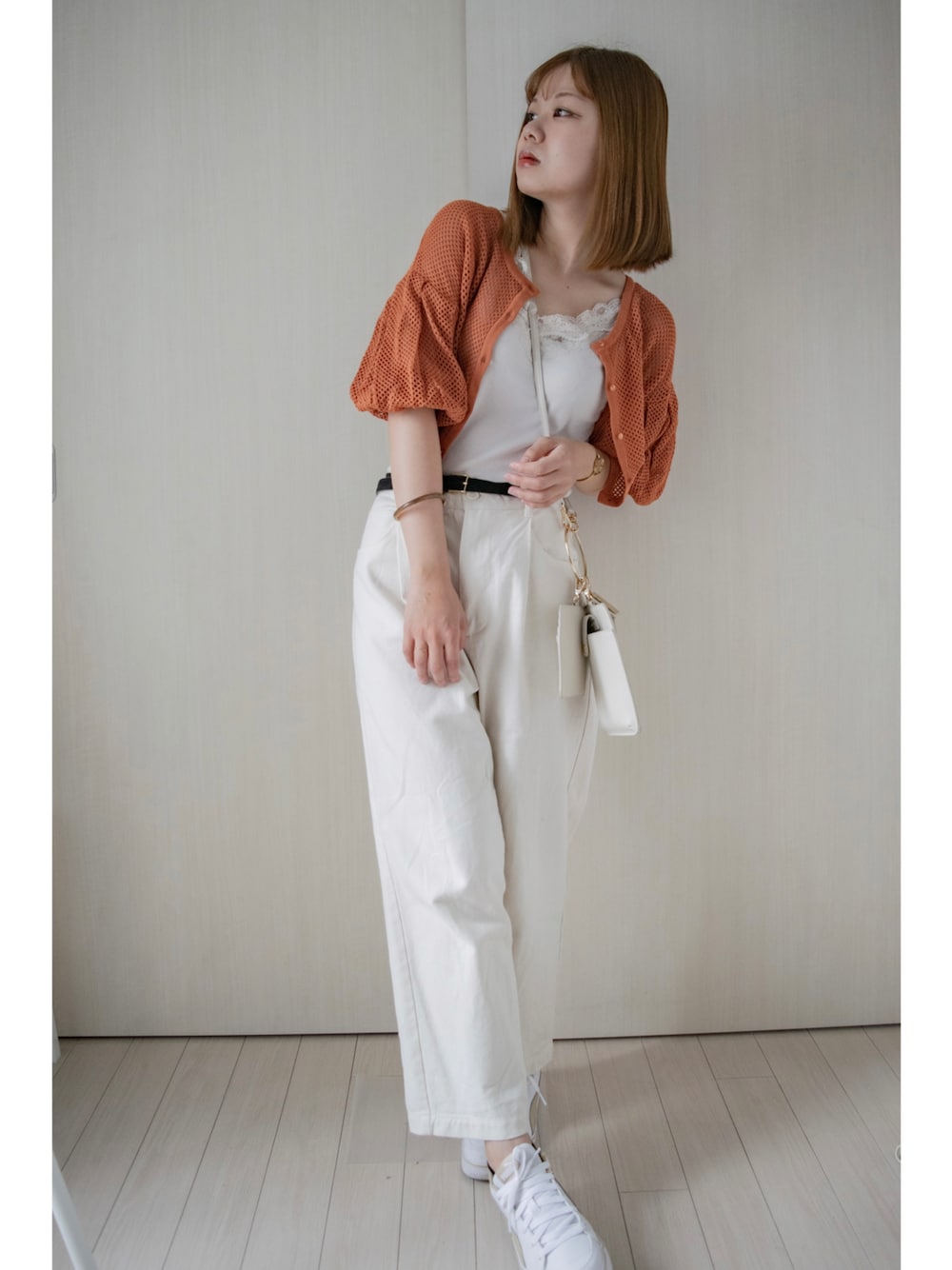 honasanのカーディガン/ボレロ「メッシュ編ボリュームスリーブカーディガン」を使ったコーディネート
