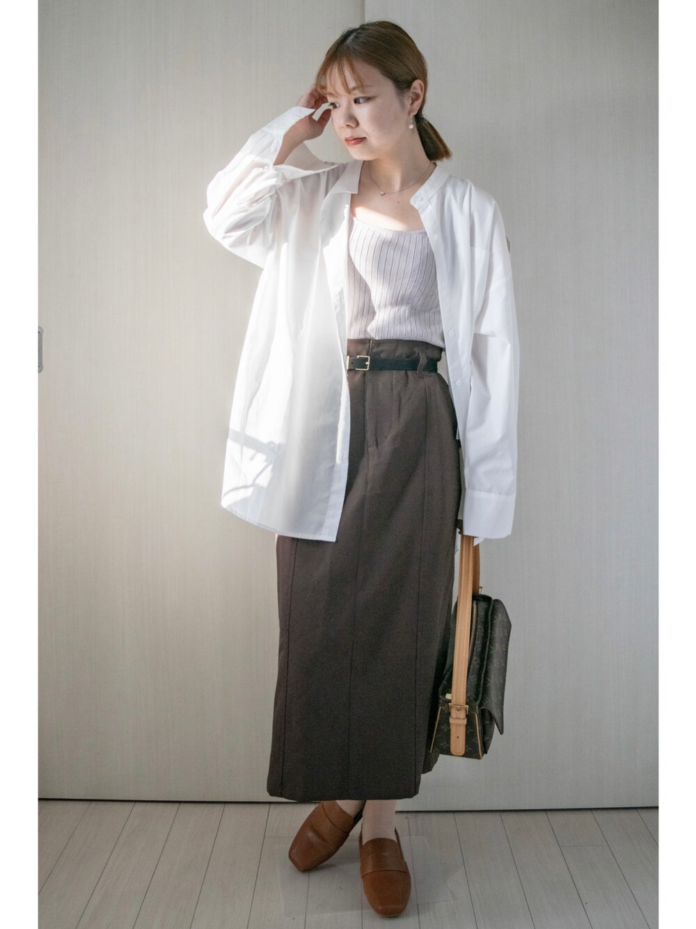 秋コーデ記録...20℃<29℃ あんまりタイトスカートって履かないんですが縦ラインが出来るとすっきりしますね。 お姉さんなコーデ😌