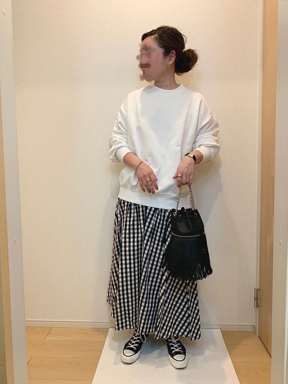 ✔︎ピアス:LOUIS DAMAS ✔︎リング:bottega veneta / TEN. ✔︎腕時計:cartier 全体を白黒でまとめたコーディネート🪐 全部無地だと物足りないのでギンガムチェックの スカートで柄を投入〜🕺🏼♥️ もう冬物着たくないから、どんだけ寒かろうが アウターは意地でも着ない事に決めた🌛