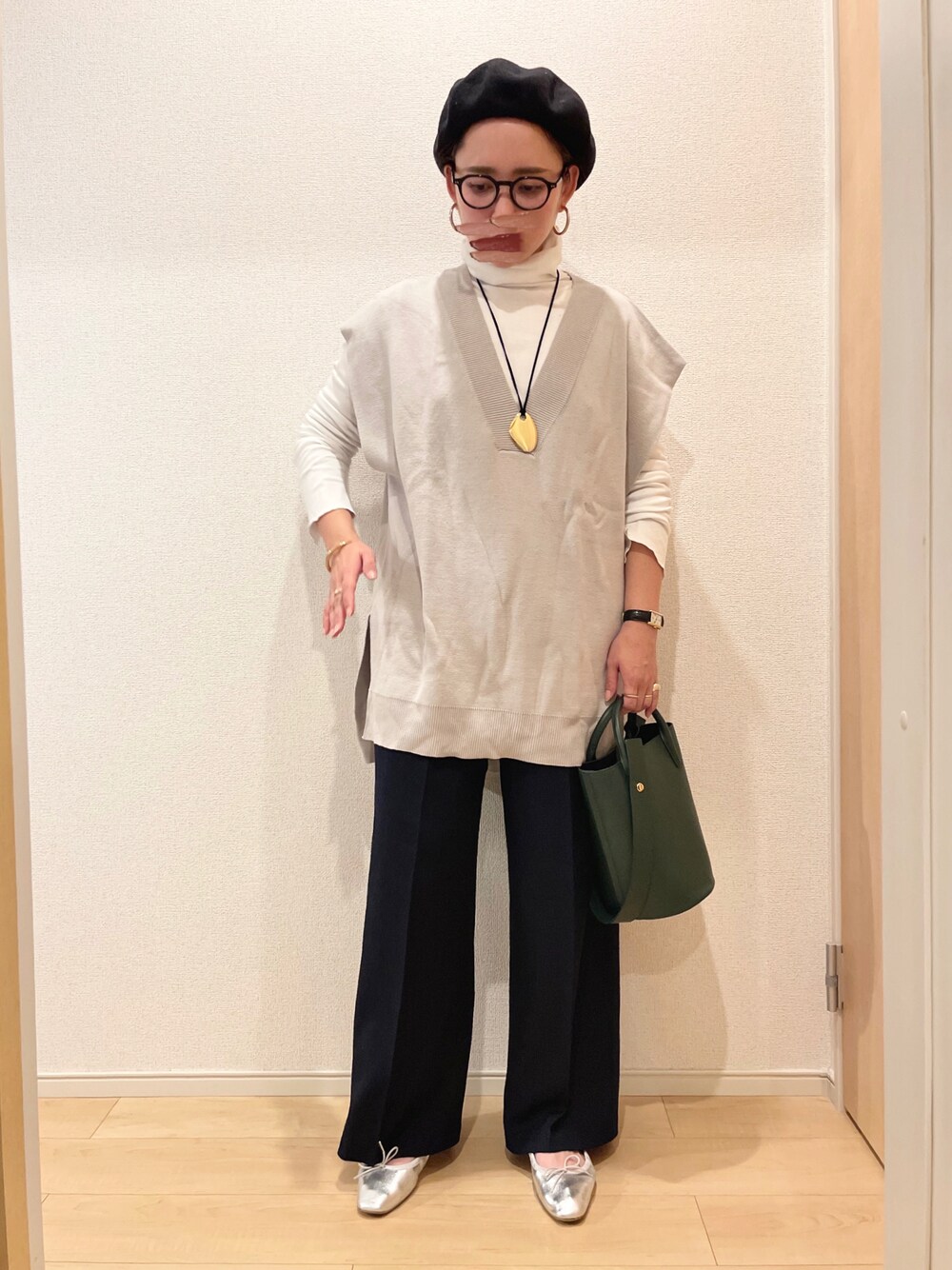 KANのベスト「ハーフミラノ重ねVネックベスト」を使ったコーディネート