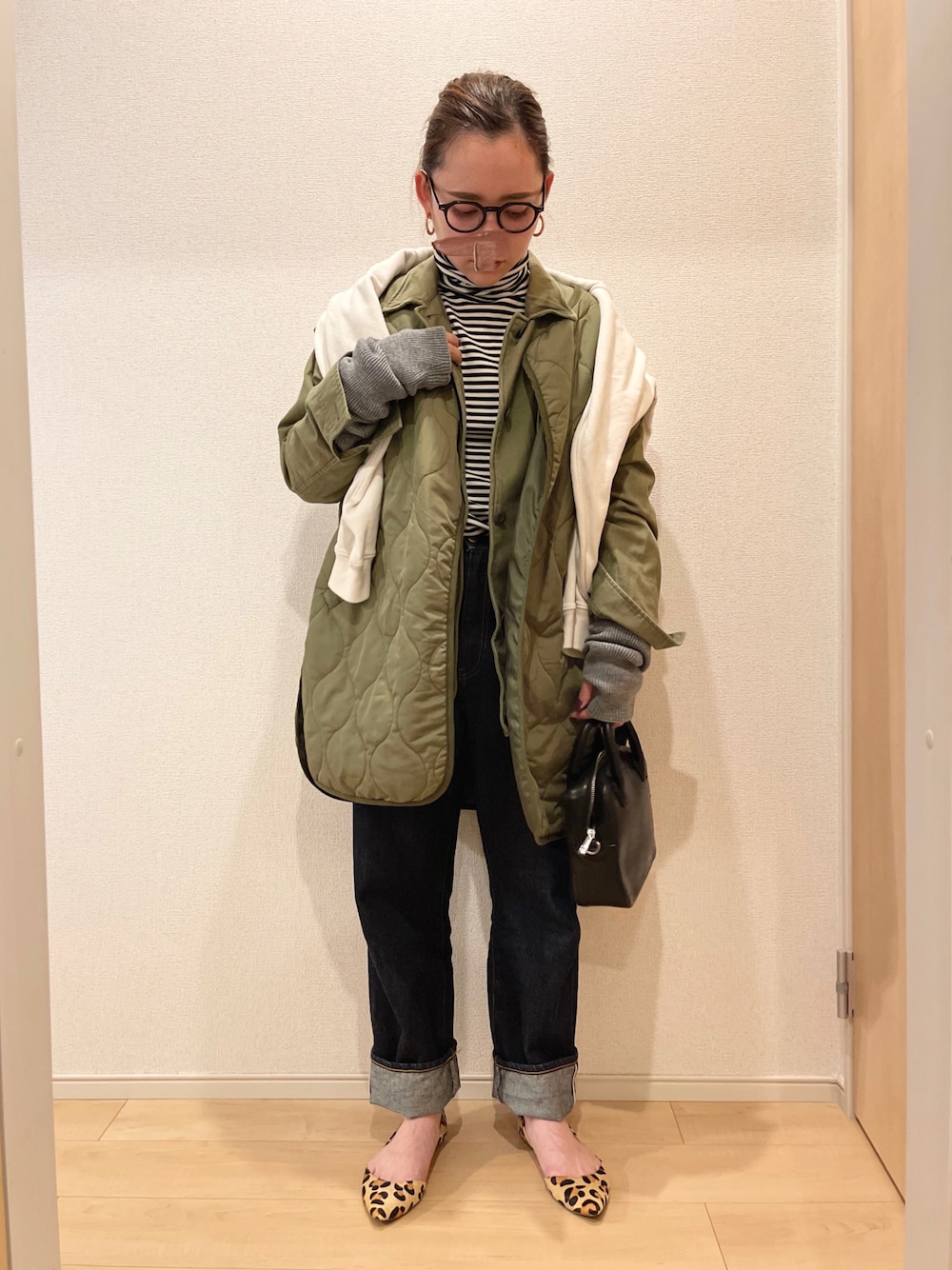 ✔︎メガネ:ZOFF ✔︎ピアス:LOUISE DAMAS ✔︎パンプス:steve madden 首元にタートル以外のボリューム感ほしくて、 襟付きのミリタリーシャツに、ベスト重ね着🥑 重ねて何の意味あるん?っていう👨🏻からの質問は無視✌🏽 素足でパンプス、寒いけどこの抜け感がスキ~~😮💨 アームウォーマーについては可愛すぎ問題♥️