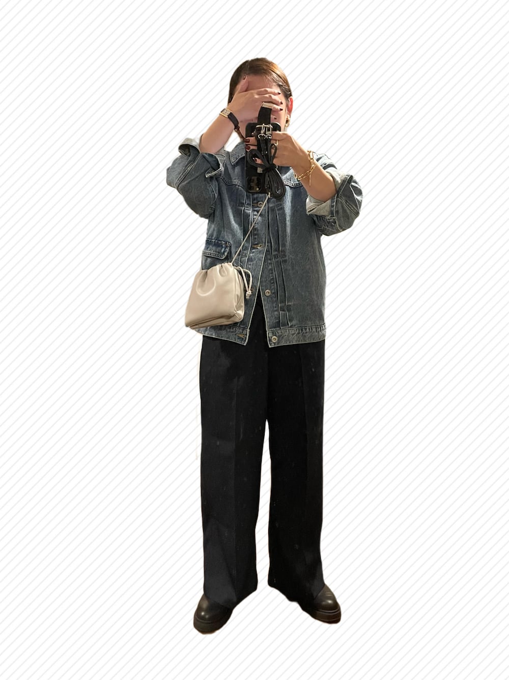 ✔︎パンツ:SLOBE IENA ✔︎ピアス:LOUISE DAMAS 風呂上がりの汚い素っぴんを隠しながら 自撮りする方法を考えた結果、このポーズ🫡 Gジャン全閉め可愛いね、暑いけど♨️♨️