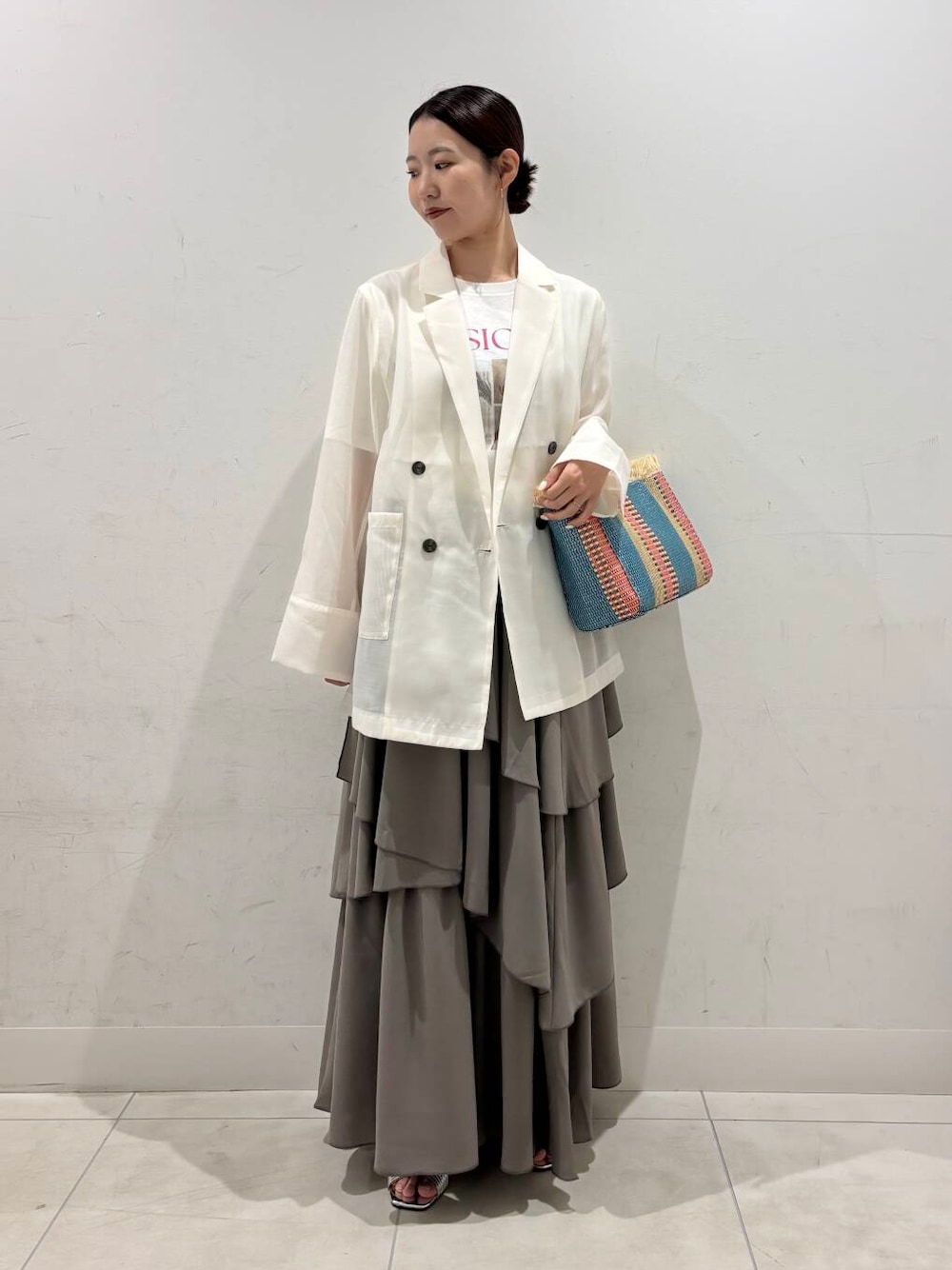 ジャケットはシアーなので夏でも着やすくなってます♪ お袖をロールアップしても可愛いです◎◎ ティアードスカートはウエストがゴムなので ゆったりと履けて楽ちんです! ロゴTはコーデのアクセントに使えるので 一枚もっていると便利だと思います!