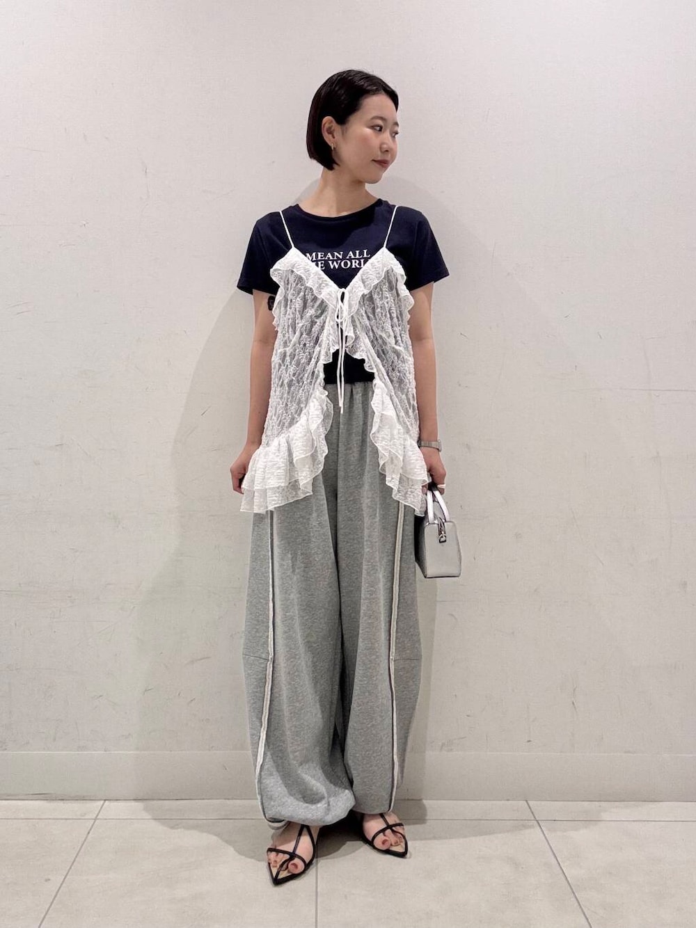 トレンドのレースを取り入れた 大人カジュアルコーデです🤍 Tシャツとスウェットの組み合わせだと 少しパジャマ感がでてしまいますが キャミトップを合わせるだけで 一気に雰囲気が変わります◎