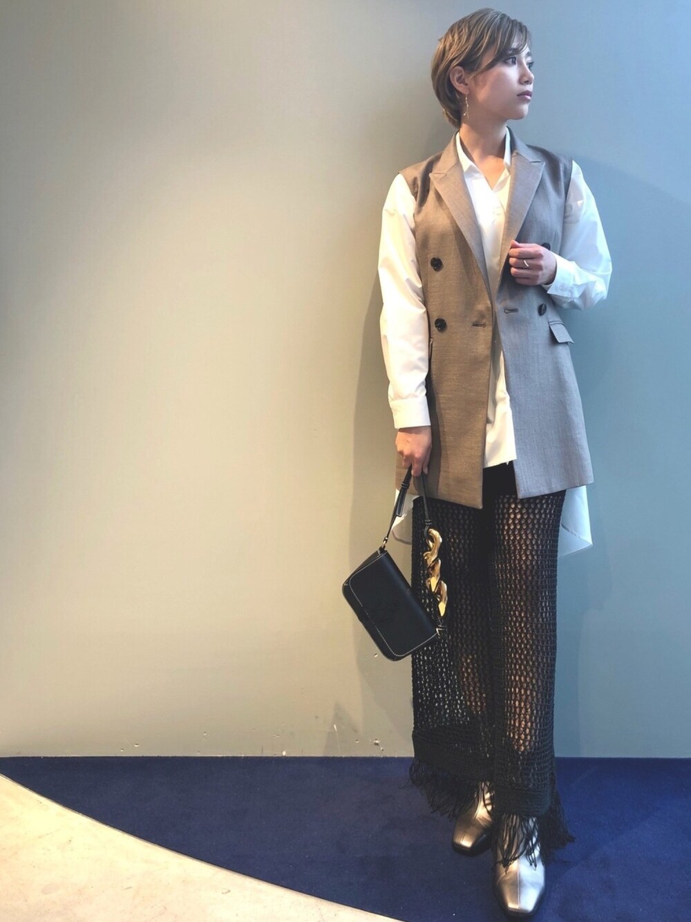 ダブルブレストのジレは、同素材のベルト付きですので、ウエストを適度にシェイプさせたアレンジした着こなしもおすすめです。 シンプルなTシャツと合わせたカジュアルな着こなしはもちろん、同素材のドロストスクイーズパンツと合わせて頂いてセットアップスタイルで着ていただいても◎