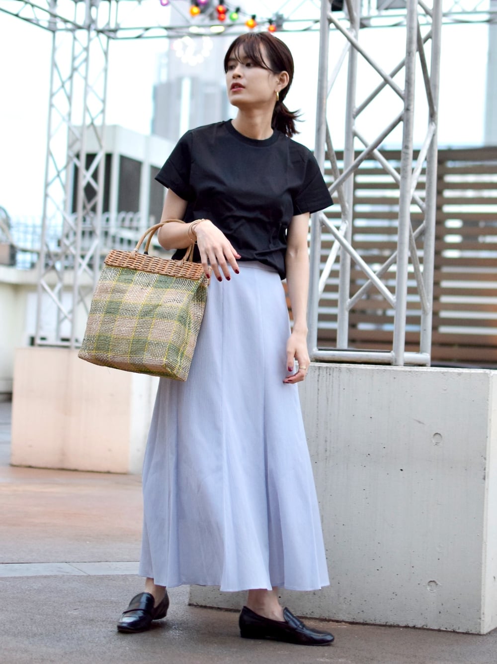 楊柳素材の軽やかなラベンダースカートを主役に、他はシンプルに黒ベースでまとめてみました◎ スカートは、長さもありフレア感も控えめなので、普段パンツが多い方にもおすすめです!