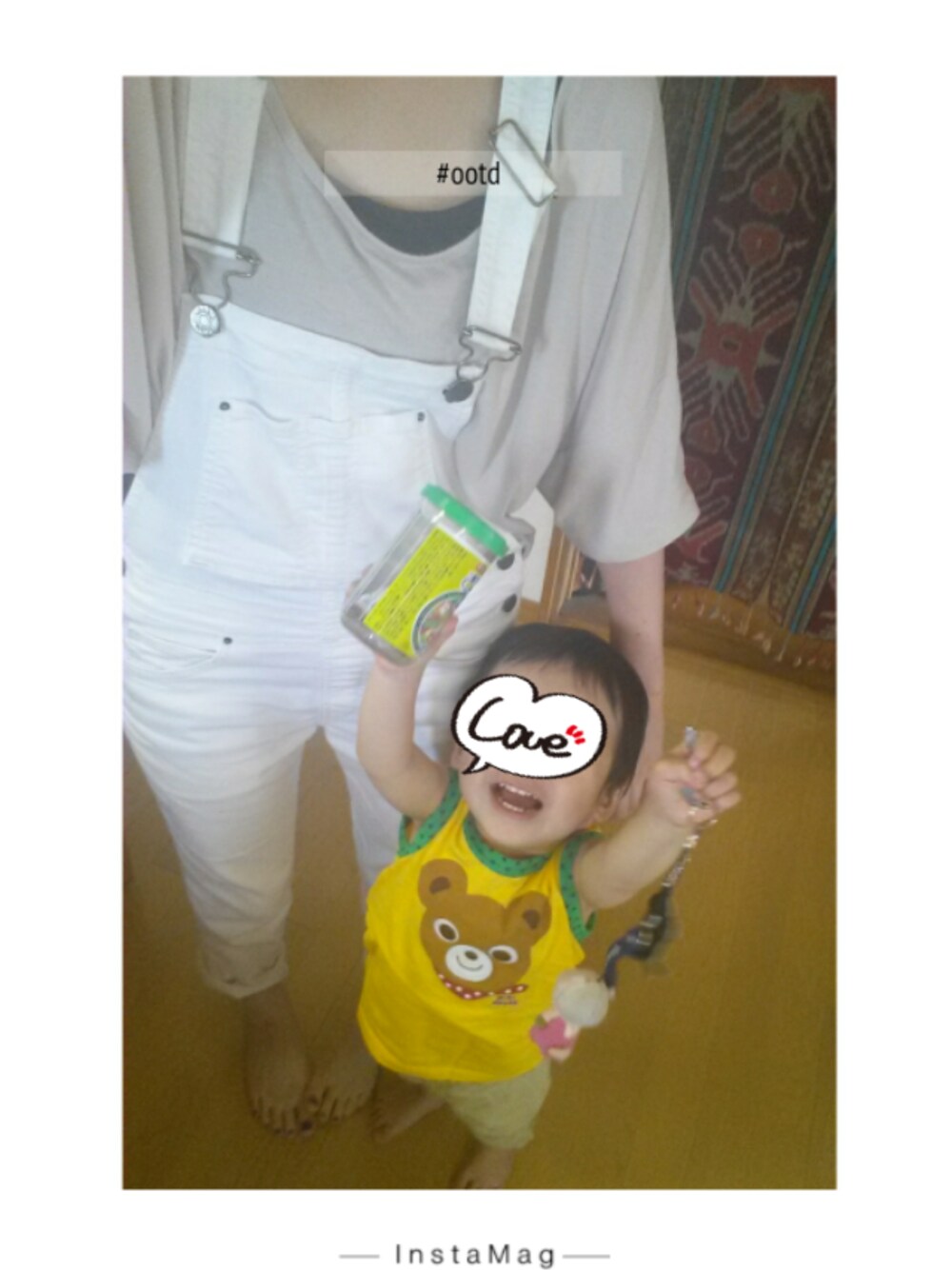瓶のふりかけとストラップを持って楽しそうな息子w ママ; アースカラーのユルT(ノーブランド) 白のオーバーオール(Mila Owen) 息子; くまのタンクトップ(mikihouse) ハーフパンツ(JUNK STORE)