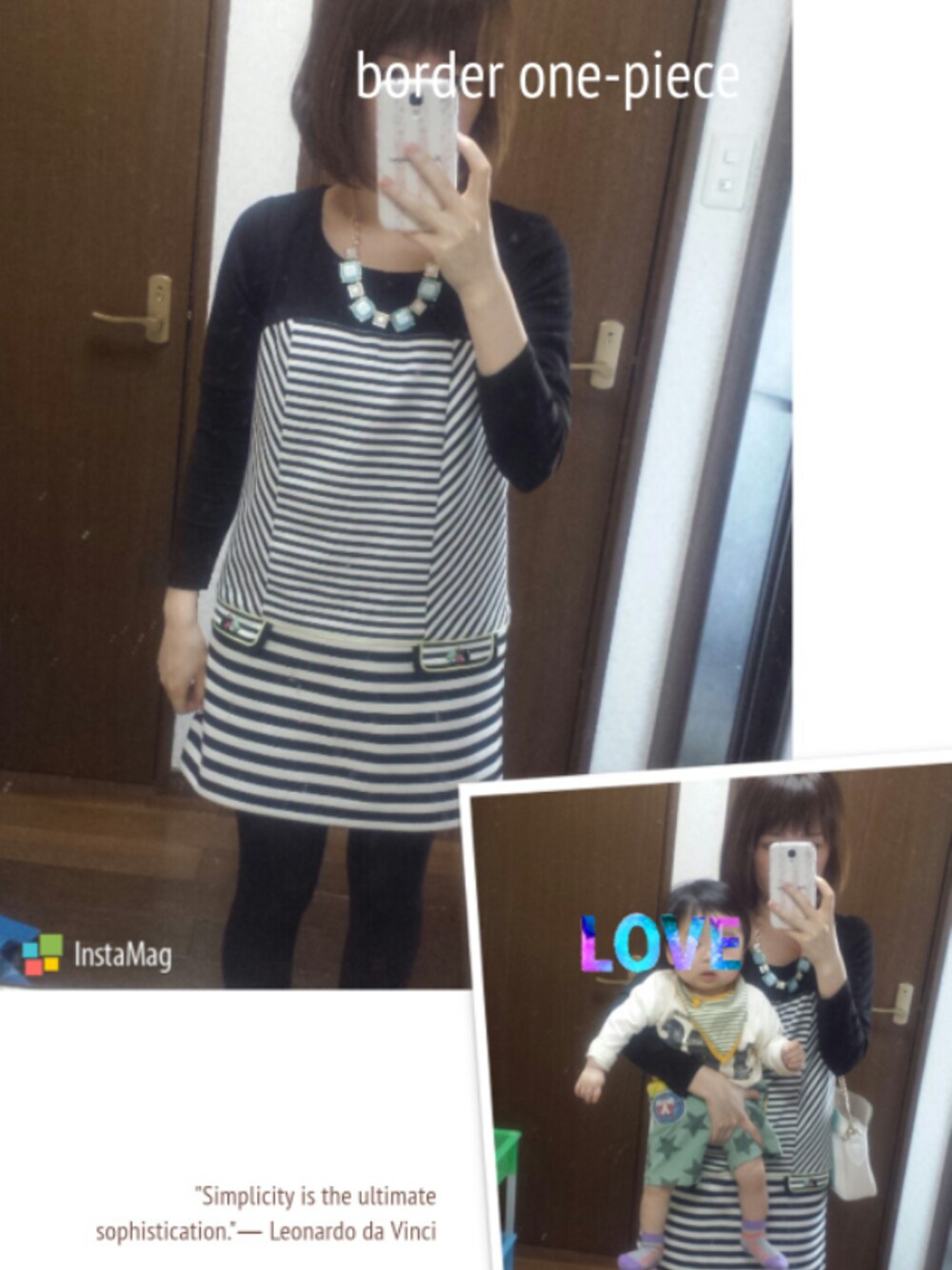 妊娠中に買ったクイーンズコートのチュニックを、身長が低いのでワンピとして着用。 チュニックは切り替えボーダーにネオンイエローのライン、ビジューつき。