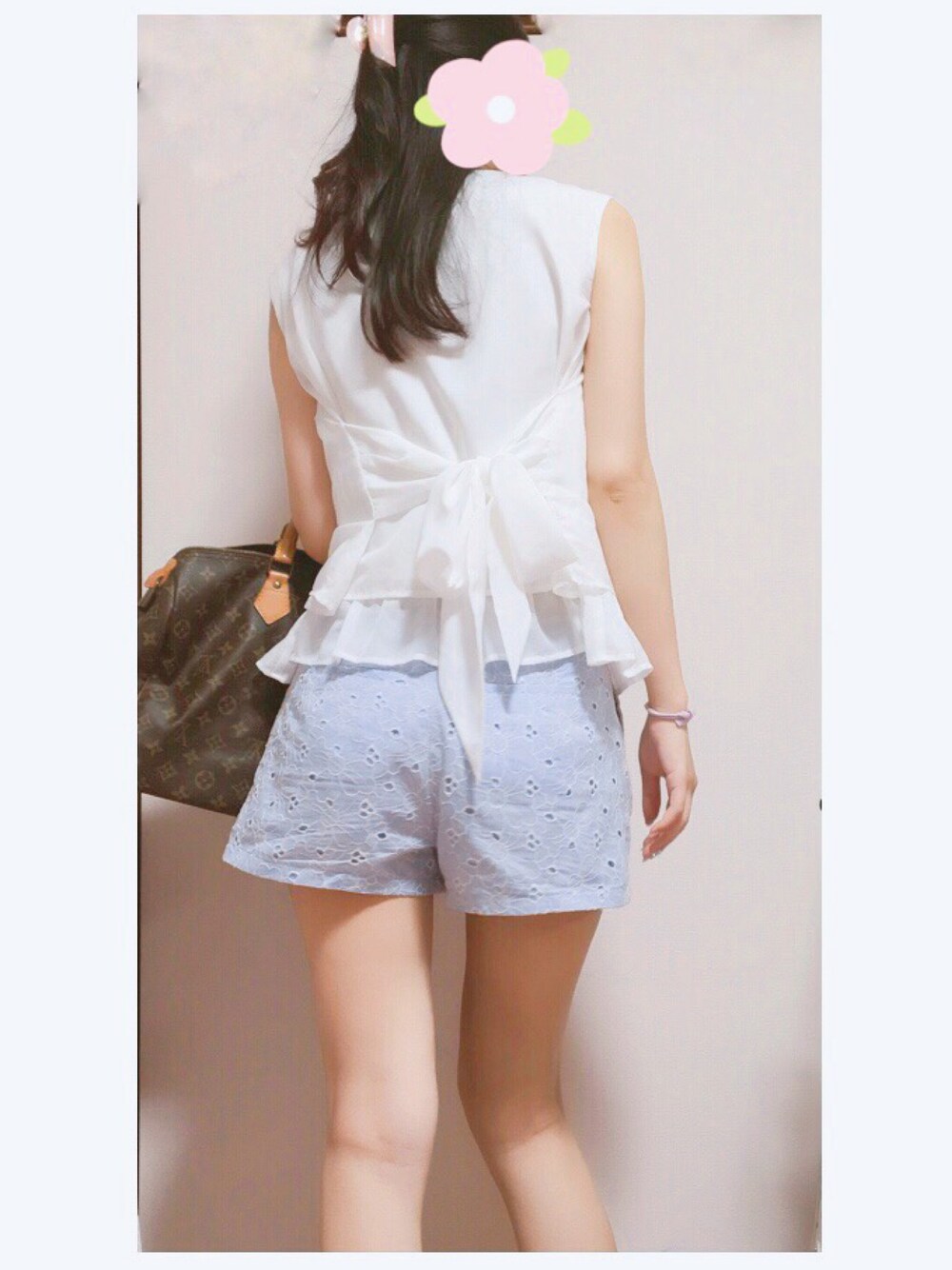 夏✨ ノエラのリボンブラウスはママからのプレゼントでお気に入り💕 前で結んでも後ろで結んでも可愛いけど、 今日は後ろで👍🏻